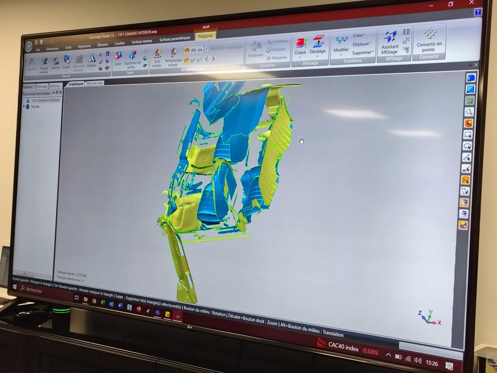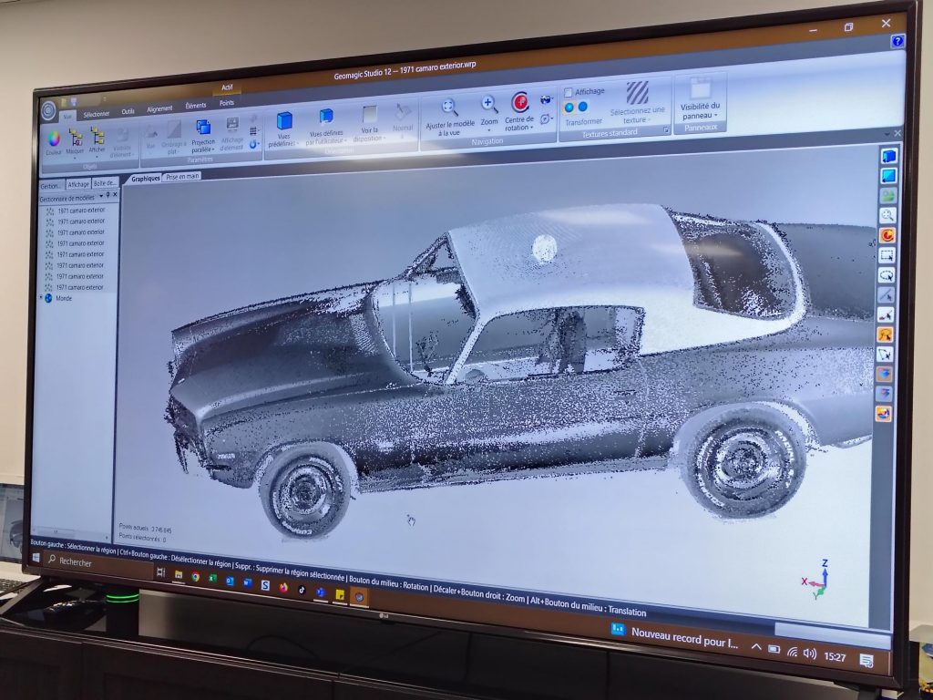 Le scanner prend à 360°, mais Arnaud le contraint dans un angle donné. Cependant, il « voit tout » et les fichiers de points doivent être nettoyés des éléments parasites. Le scanner reconstitué pèse plus d’un gigaoctet une fois nettoyé. Il va compter plus de 3 millions de points. C’est largement trop pour un modèle au 1:18e. Mais, ces scans peuvent servir à d’autres marques du groupe et autant prendre le plus de détails possibles, quitte à en éliminer par la suite pour les moules. Pour nous montrer à quoi cela ressemble, Arnaud prend l’exemple de la Chevrolet Camaro Z28 RS Daytona Yellow 984 1970. 3,75 millions de points et malgré tout des « trous » dus au chrome, aux reflets, ou autre.