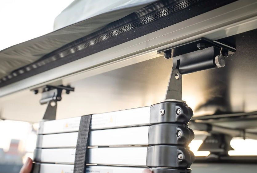 De plus, sa conception pliable permet de la transporter facilement sur le toit du véhicule, sans gêner la conduite ni nécessiter de démontage complexe. Une échelle amovible permet d’y accéder aisément, ajoutant à la praticité de l’ensemble.
