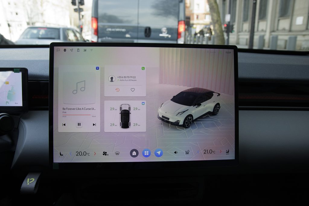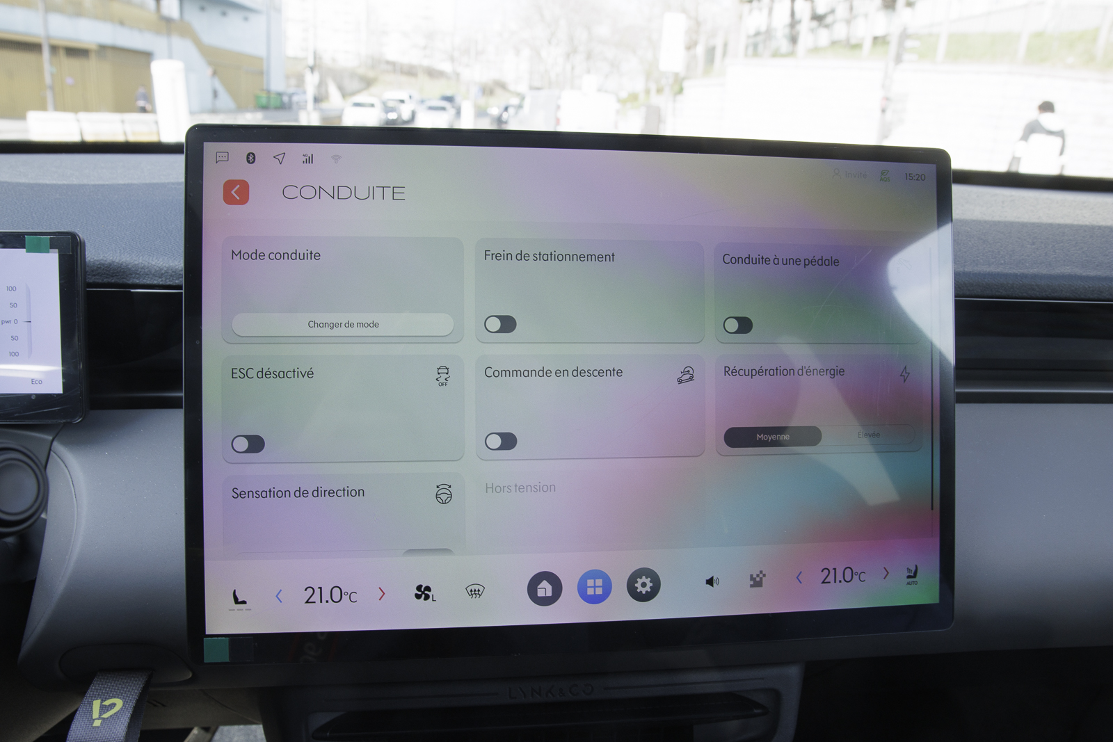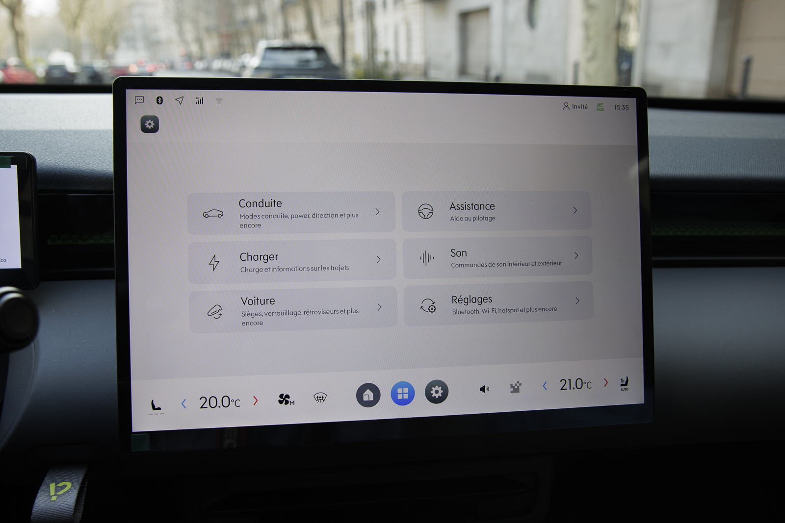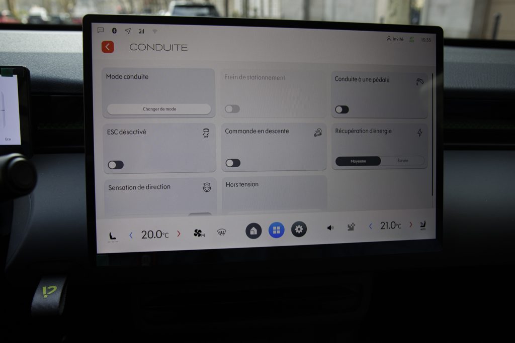 L’intérieur en tout cas est agréable et épuré, façon Tesla, mais avec un écran côté conducteur aussi ! On notait des alertes sonores des aides à la conduite envahissantes, mais l’auto propose un imposant volet de raccourcis sur l’écran pour y accéder rapidement. Sur ces quelques kilomètres, l’auto propose un confort très honorable, une direction agréable et une belle progressivité de ses capacités électriques : pertinent en ville …