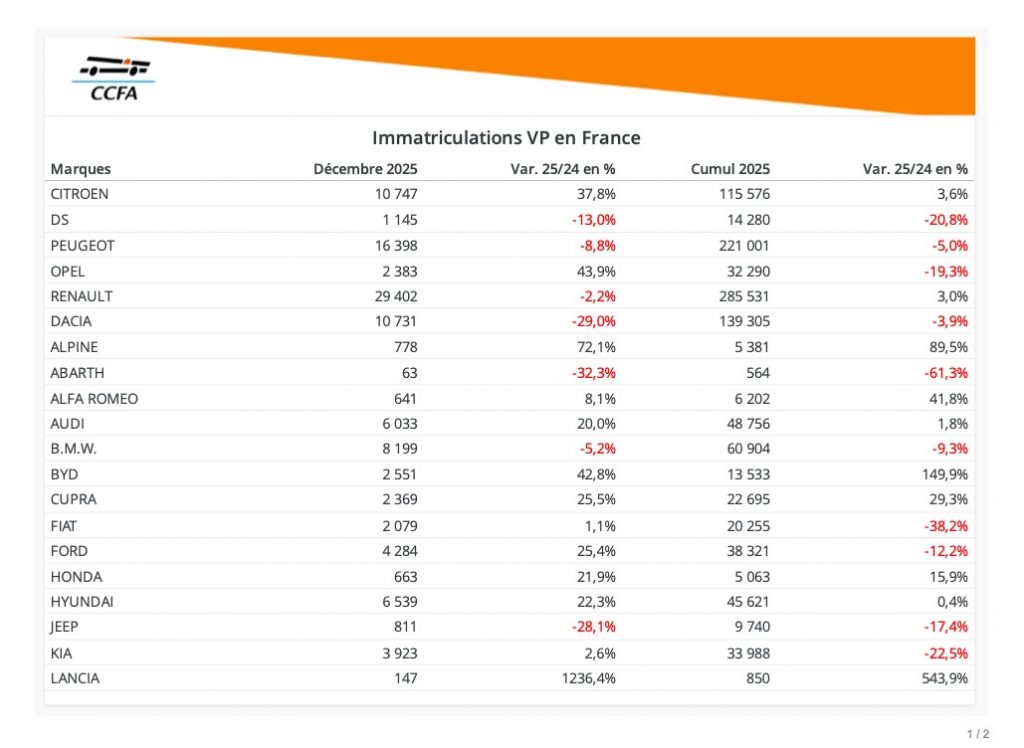 c’est bien une année catastrophique, mais avec des voitures moins chères 2026 s’annonce mieux, reste à voir si le cout de la vie ne va pas continuer à augmenter nettement plus vite que les salaires . reste à voir la rentabilité de certains dans quelque semaines. il me semble que ceux qui ont bradé à longueur d’année ,vw, tesla, … ou ceux qui ont immatriculé à tour de bras, peugeot citroen aux stocks impressionnants’ (dixit l’argus), ne vont pas y laisser trop de plumes. superbe gadin pour les hideuses kia, toyota enfin en chute importante, volvo qui s’écroule partout en europe, leapmotor bof, moitié moins qu’alpine, bien plus chères. qq succès , clio ,r5 , 2008, bigster, elroq ,bmwix1, mini et cupra , et quelque bides, hyundai inster pas dans le top 100 , peugeot 408 invisible , kangoo, qui surfait bien plus haut les générations précédentes, e mégane , et kia gamme ev… je ne citerai pas la pauvrette citroén qui embarrasse les stocks de la marque, pour ne pas facher sgl
