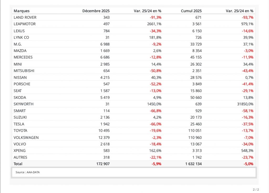 Stellantis n’est pas le seul groupe en difficulté. La marque Volkswagen affiche une baisse similaire de 7%. Le mauvais résultat le plus étonnant est probablement celui de Toyota. Inexorablement, les ventes de Yaris baissent et la firme japonaise est à la peine. Et le mois de décembre ne fait qu’amplifier le phénomène. Au delà de l’état dramatique de Jaguar et de Land Rover, Mitsubishi et Volvo sont bien mal en point. Mais le gadin de l’année revient à Tesla qui multiplie les mauvais mois. Seuls Suzuki et Ford qui finissent l’année sur un note d’espoir semblent à même de repartir sereinement en 2026.