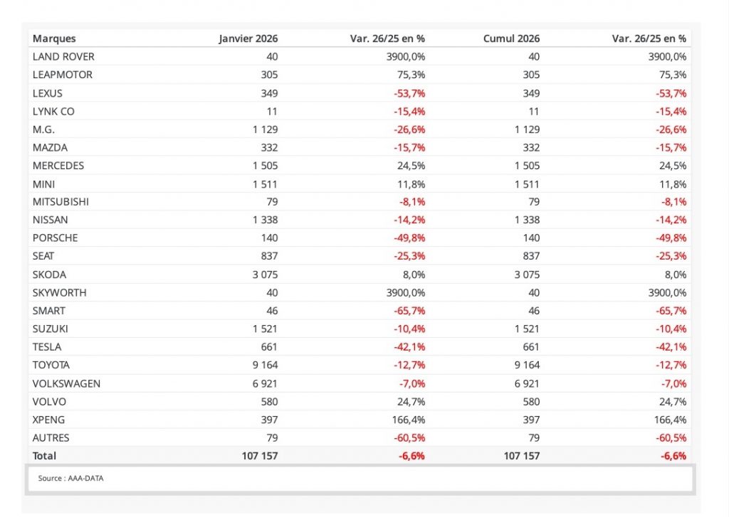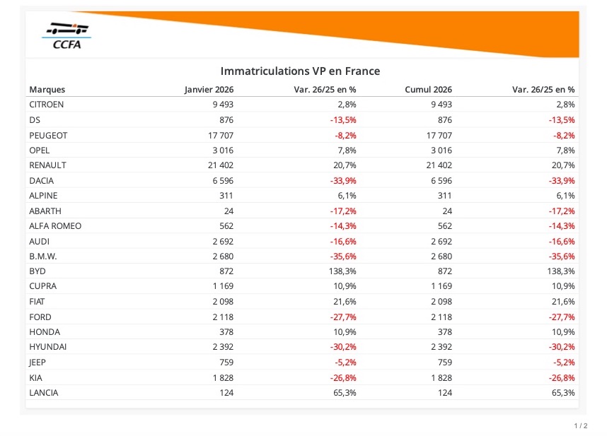 Le marché français démarre aussi mal l’année 2026 qu’il avait terminé la précédente. Le bon score de Renault, mais aussi ceux de Mercedes, de Volvo et de Fiat contrastent avec la morosité ambiante. Le marché est en baisse de 6,55% comparé à l’an dernier et de 30,9% comparé à 2019, année de référence avant Covid.