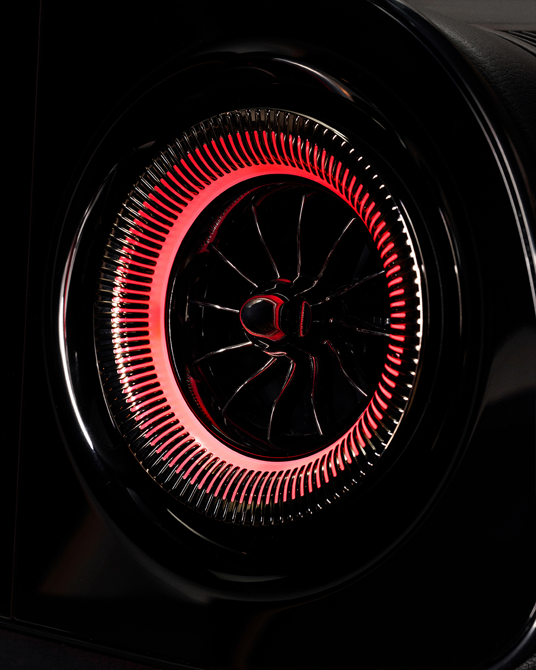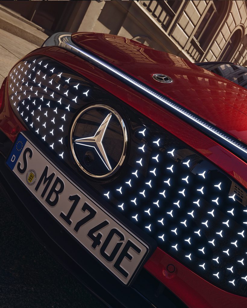 Globalement, la CLA est plus agréable à regarder et plus élancée que les précédentes EQ qui avaient un petit air pachydermique. L’avant est tout de même chargé. Il se distingue par des feux-bandeau (comme à l’arrière) qui singent étrangement Smart et par les ouïes d’aération béantes sur les extrémités du bouclier, mais surtout par une très grande calandre noire brillante parsemée de 142 étoiles LED animées individuellement et le logo de la marque également éclairé, histoire de ne pas passer inaperçu. Certainement, de quoi être bien vu dans un rétroviseur…Est-ce le « 2002 Turbo » des temps modernes ? Ce n’est pas forcément la philosophie maison, mais la clientèle Mercedes a pas mal évolué depuis vingt ans. Elle s’est rajeunie et goûte bien plus l’affichage. Tous les modèles CLA sont aussi équipés de série d’un vaste toit panoramique. Ce toit monobloc fixe en verre, dépourvu de renfort central, s’étend du cadre du pare-brise jusqu’à l’arrière. Il offre une nouvelle expérience intérieure avec une vue quasiment dégagée vers le haut.