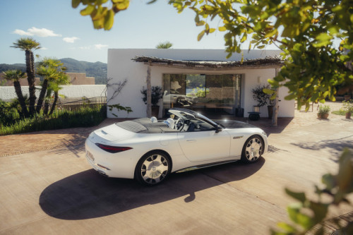À l’intérieur, le cabriolet offre une ambiance aérienne grâce à l’utilisation de cuir Nappa blanc cristal, tanné de manière durable. L’agencement floral des sièges, les finitions chromées et les surfaces généreusement garnies créent une atmosphère à la fois spacieuse et cocooning. L’accès est facilité par des panneaux latéraux abaissés, tandis que le rembourrage assure un confort optimal pour les longs trajets.