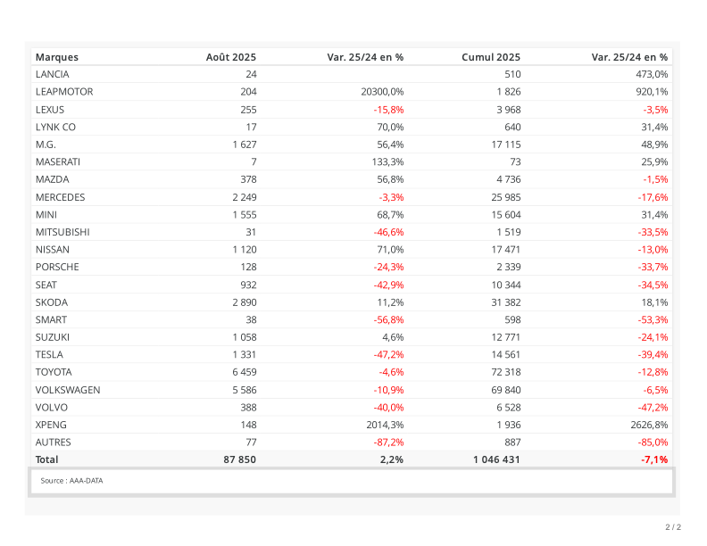3. la seule bonne nouvelle ,c’est le gadin continu de tesla. pour le reste aie. peut etre que les constructeurs vont arreter d’etre sourds, et baisser copieusement le prix des ve, et des termiques. histoire de faire tourner les usines. mais bon septembre ne sera pas mieux , avec en plus dans qq jours l’éviction du souffreteux bayrou, et un président catastrophique, ça va pas rassurer le peuple dans les semaines à venir.
