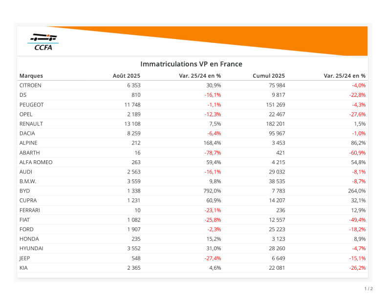 Le marché automobile français retrouve une petite progression en août 2025. C’est un sursaut pour certains, un coup de fouet pour d’autres comme Citroën, Nissan ou Hyundai. Mais le très mauvais mois d’août 2024, -24,3%, incite à relativiser cette reprise.
