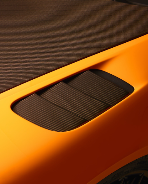 L’extérieur de « La Tulipe » est entièrement recouvert de la couleur Pastel Orange, symbolisant l’identité nationale néerlandaise. Cette teinte unique habille chaque élément de la voiture, y compris les prises d’air en fibre de carbone du capot, les disques aérodynamiques arrière, et le lettrage Porsche sur le spoiler arrière.