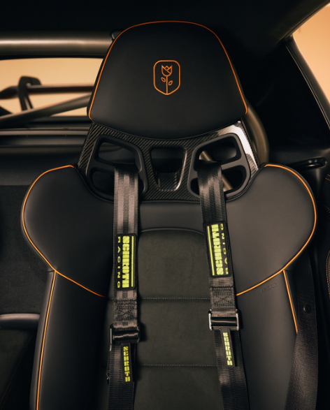 L’intérieur de « La Tulipe » est tout aussi travaillé et réfléchi que l’extérieur. Le thème floral se poursuit avec des motifs de tulipes illuminés sur les seuils de porte et la même fleur brodée sur les appuie-tête des sièges baquets. Le cuir noir combiné au Race-Tex domine l’habitacle, tandis que des détails orange vif rappellent et harmonisent l’extérieur avec l’intérieur.