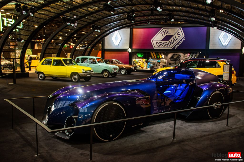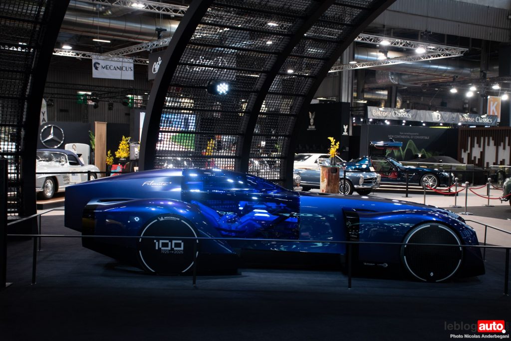 Comme souvent, Rétromobile est aussi un moyen pour les constructeurs de communiquer aussi sur l’avenir. Renault exposait ainsi son concept futuriste électrique Filante, qui faisait face à la Renault 40CV des records de vitesse de 1925