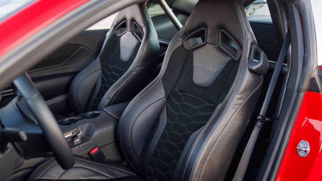 Pour compenser la prise de masse induite par le compresseur et le renforcement du châssis, Shelby a gagné du poids sur la carrosserie en usant de la fibre de carbone pour le capot et d’autres éléments aéro. Les sièges arrière ont été supprimés, mais l’habitacle reste cossu avec le recours à du cuir et de l’alcantara. La Shelby Super Snake-R pèse tout de même 1 810 kg, soit seulement 35 kg de plus que la Ford Mustang Dark Horse.