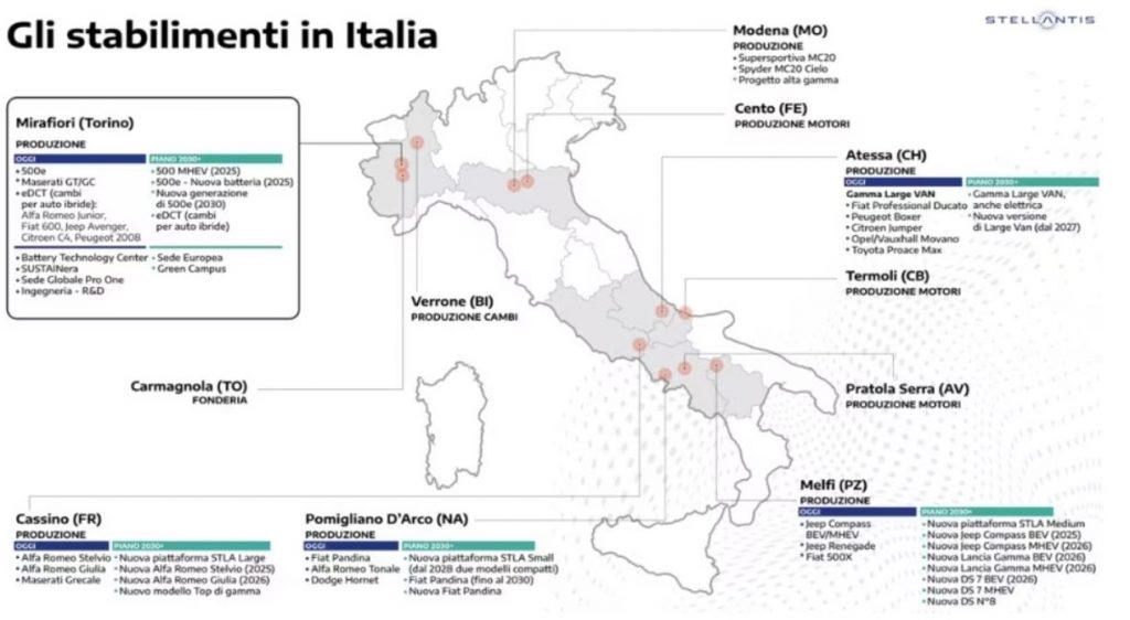 « la production et l’emploi en Italie au centre de la stratégie de Stellantis, avec le maintien de toutes les usines, des investissements importants en recherche et développement, dans de nouveaux modèles et plateformes de production, avec la valorisation du Made in Italy et la protection de l’emploi, la reconversion des compétences et le renouvellement générationnel« .
