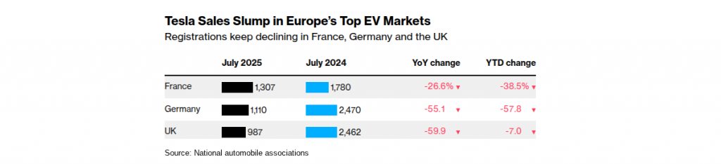 En juillet 2025, les immatriculations de Tesla ont chuté de plus de 50 % par rapport à la même période de l’année précédente dans ces deux pays. Ce déclin touche également la France, troisième marché européen pour les véhicules électriques, où les ventes de Tesla ont reculé de 27 % en juillet, et sont en baisse de près de 40 % depuis le début de l’année.