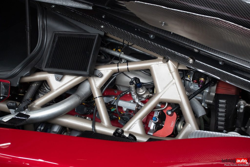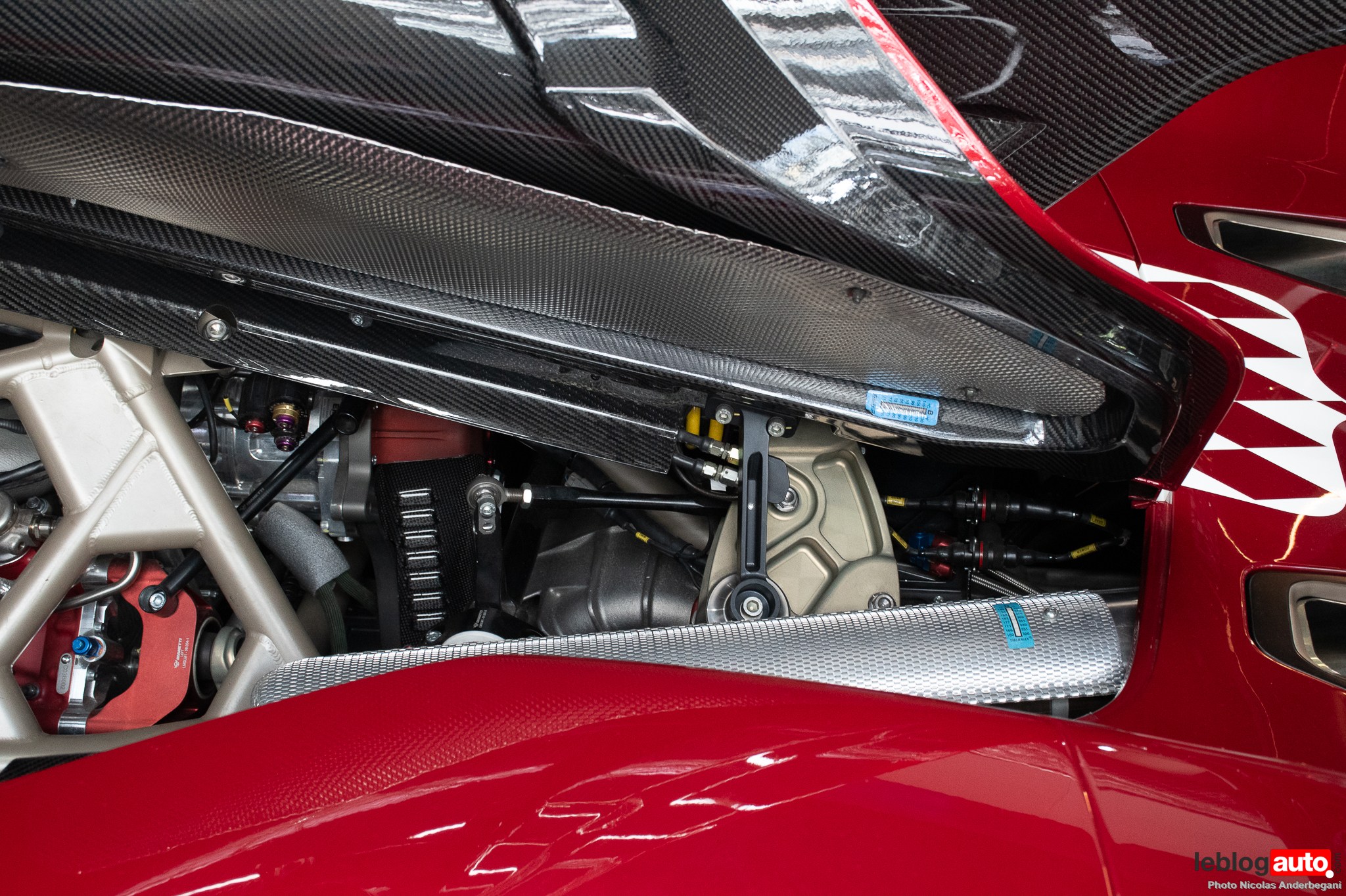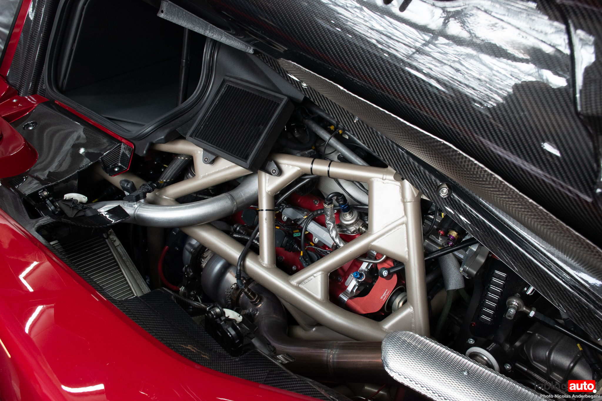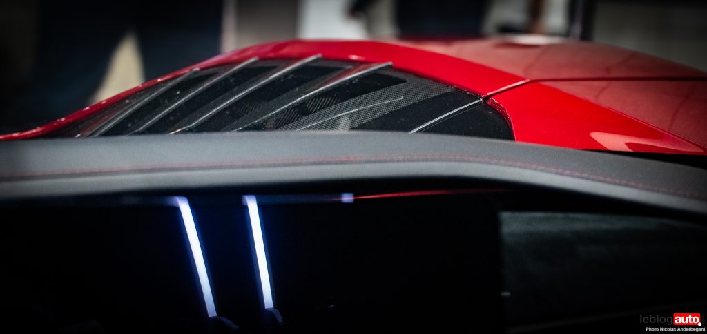 Dans cet intérieur de type cockpit, qui transpire la compétition, un grand écran tactile avec l’Apple Car Play civilise un peu la bête. On note aussi les deux grandes baffles situées entre les deux sièges. En ouvrant le capot, on trouve même un petit espace « bagages » de 65 litres, astucieusement placé entre la cellule de l’habitacle et le compartiment moteur. Enfin, un système de levage permet de surmonter les obstacles « favoris » des supercars, à savoir les dos d’âne.