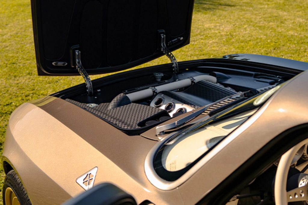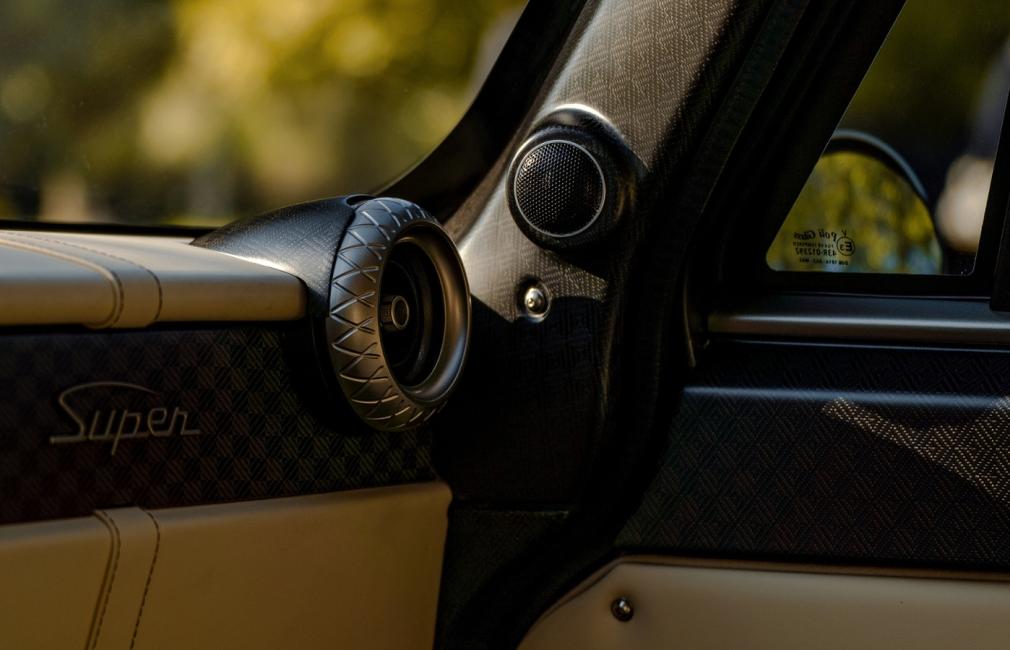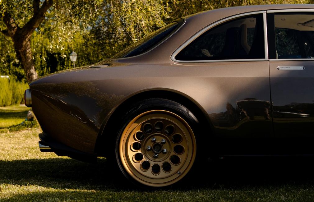 Sa teinte exclusive se nomme “Luci del Bosco”, « lumière des bois » en Français, tirant vers un brun métallisé profond, qui évoque les GT italiennes d’antan. Sa teinte métallisée a été étudiée pour refléter la lumière envoûtante de la Toscane et de ses somptueux paysages vallonnés. Les jantes dorées, les finitions nickel satinées et les éléments en carbone satiné confèrent à l’ensemble une élégante certaine. Chaque détail est pensé : poignées de porte affleurantes, logo Totem usiné, signature lumineuse fine et fluide. Le tout est entièrement réalisé à la main en Italie.