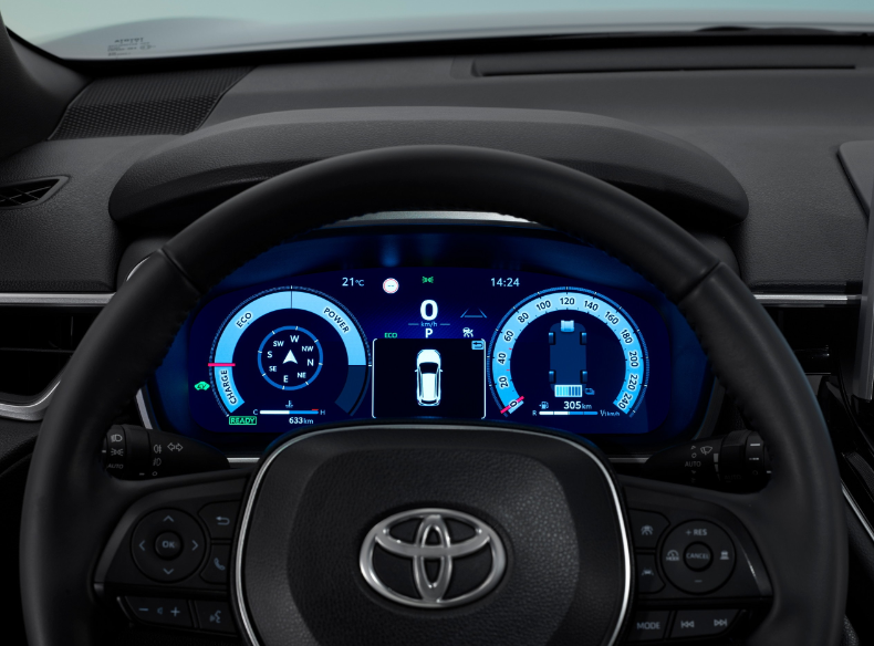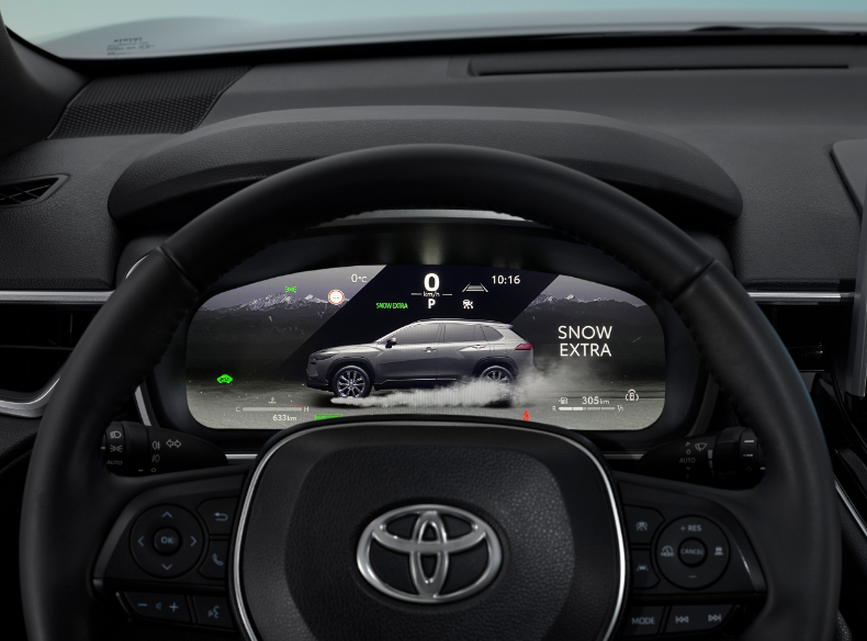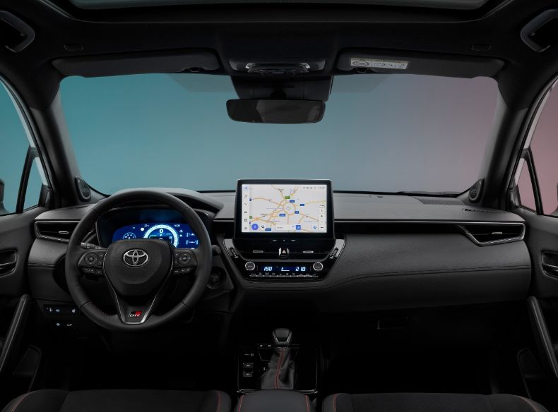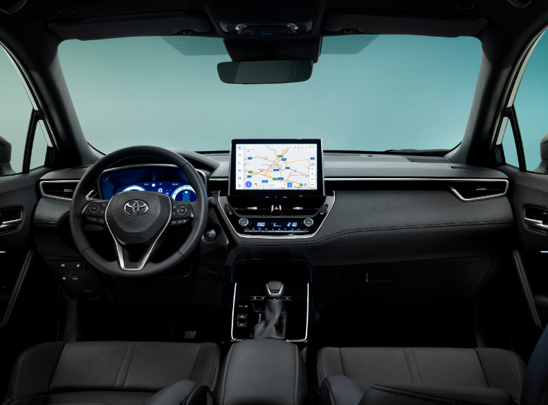 À l’intérieur, la Corolla Cross propose un espace spacieux et moderne avec des équipements pensés pour le confort et la connectivité. On note une console centrale repensée, un espace de rangement pratique, un chargeur sans fil de série et des ports USB. Côté infodivertissement, le pack Toyota Smart Connect inclut un écran tactile de 10,5 pouces et un tableau de bord numérique de 12,3 pouces sur la majorité des modèles européens. L’éclairage ambiant, les sièges chauffants et le volant chauffant sont également au menu.