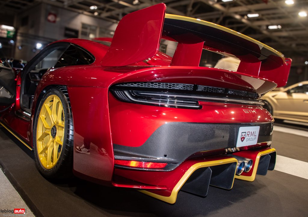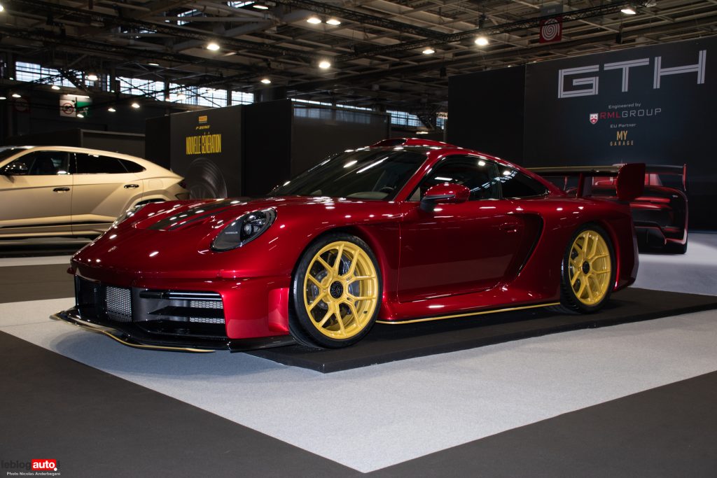 L’évocation des grandes heures du sport automobile allemand s’incarnait dans deux créations assez incroyables : d’abord, les anglais de RML, bien connus dans le sport automobile, exposaient la GTH (H pour Hypercar). Il s’agit d’une Porsche 911 GT3 Type 992 rhabillée à la façon de la 911 GT1 de la fin des années 90. La livrée rouge et or lui donnait une allure très élégante.