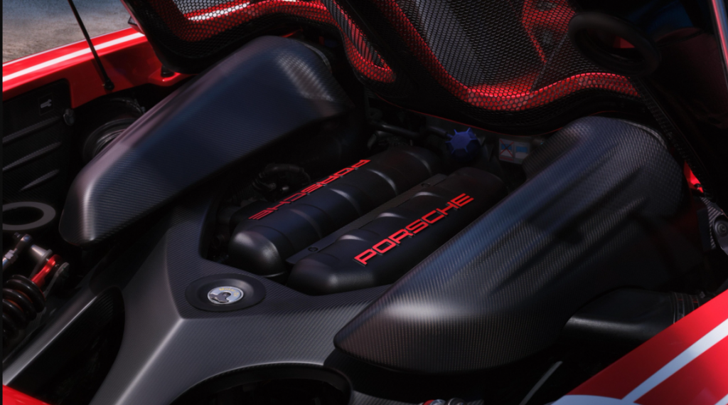 Le carbone mat est également présent dans l’habitacle, créant un contraste visuel marqué avec l’Alcantara. Il habille notamment les coques de siège, les entourages des aérateurs et le revêtement des instruments. Pour les panneaux centraux, les joues latérales et les appuie-tête, Porsche a utilisé un textile noir FIA issu de la 918 Spyder, un tissu ignifugé conforme aux exigences du sport automobile. Ce choix fait écho à la Porsche 917 d’origine, déjà équipée de deux sièges, rendus obligatoires à l’époque pour les courses d’endurance.