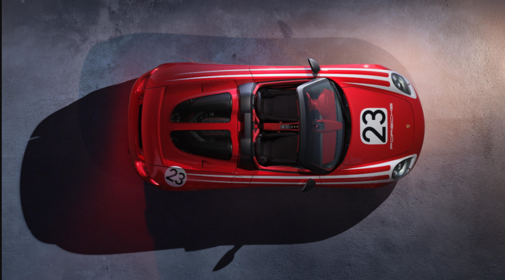 La livrée rouge indien et blanche, réalisée à la main, reprend le célèbre numéro de départ 23. Elle est protégée par un film transparent, permettant à la voiture de circuler sur route ouverte, notamment à Porto Rico. L’esthétique extérieure est complétée par de nombreux éléments en carbone noir mat : moitiés de toit, piliers A et B, coques de rétroviseurs, prise d’air avant et diffuseur arrière. Les grilles du capot moteur sont anodisées en noir mat, tandis que les jantes en alliage léger à cinq branches, peintes en noir, conservent leur dessin d’origine et reçoivent un écusson Porsche en couleur.