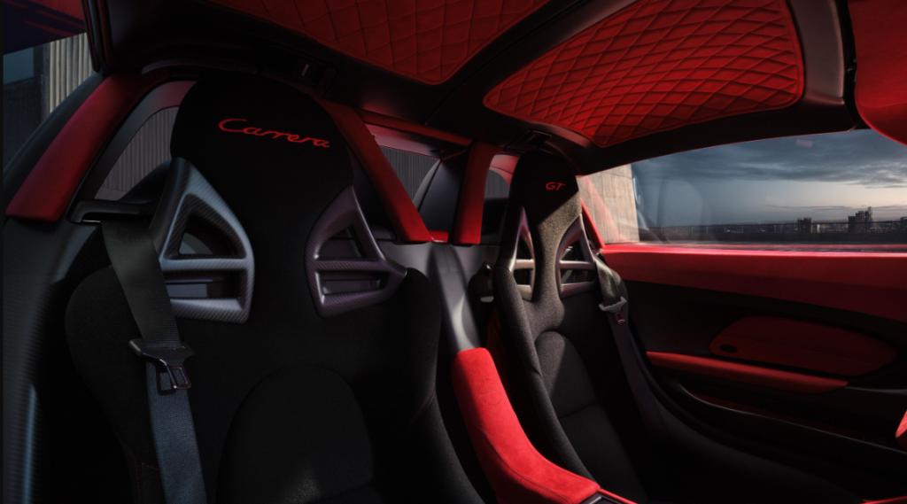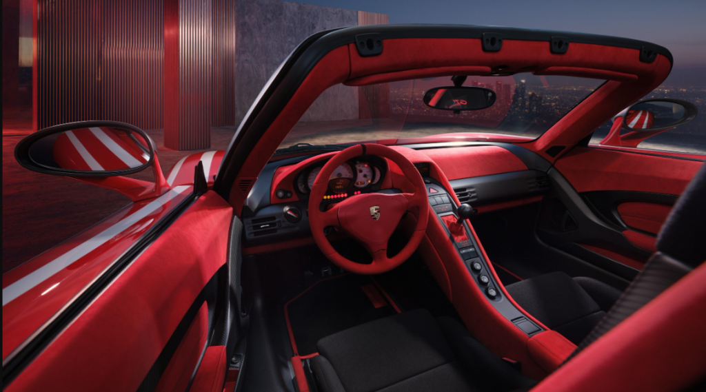 L’intérieur de la Porsche Carrera GT a lui aussi été entièrement repensé selon les souhaits du propriétaire. Le département sellerie de Porsche a recouvert de nombreuses surfaces d’Alcantara rouge indien, un matériau apprécié dans l’univers automobile pour son toucher et son maintien. Le tableau de bord, les panneaux de porte, la couronne du volant et la console centrale adoptent cette finition, tout comme le coffre avant et le jeu de bagages.