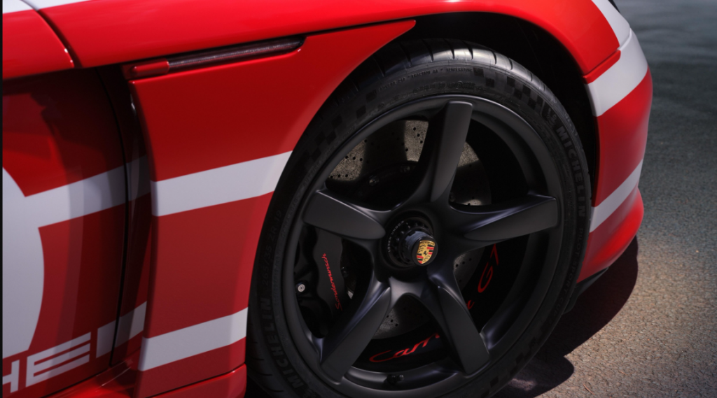 Le choix du design Salzburg n’a rien d’anodin. Il fait référence à la Porsche 917 rouge et blanche, numéro 23, qui a offert à la marque sa première victoire au classement général des 24 Heures du Mans en 1970. Cette identité visuelle, devenue mythique dans l’univers de l’endurance et du sport automobile, a été adaptée avec précision aux lignes et aux proportions très différentes de la Carrera GT, un exercice de style complexe et inédit.