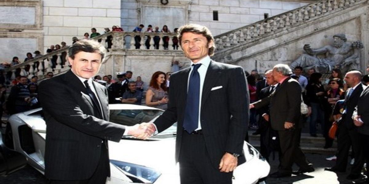 Stephan Winkelmann, chef de la direction de Lamborghini et le maire de Rome Gianni Alemanno ont participé à une présentation publique, hier, du dernier fleuron de la marque en pleine place romaine. Cette séance photos fêtait surtout l’annonce du prochain grand évènement de la marque après une conférence de presse au Capitole. La Lamborghini Aventador LP700-4, placée à côté du Capitole sur la photo, fût la star de cette journée et le sera encore un certain temps pour promouvoir le savoir faire italien.