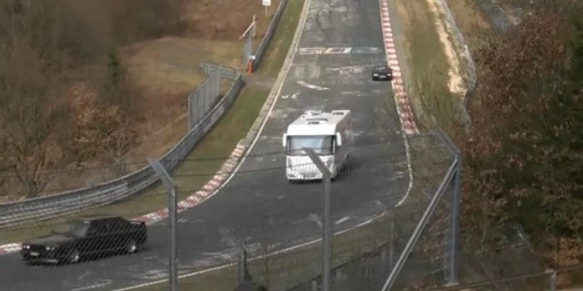 Comme vous le savez le circuit allemand du Nüburgring est très prisé des professionnels comme des apprentis pilotes car on peut facilement y faire un petit tour avec sa voiture personnelle. On peut voir de tout, des Opel Meriva pilotée par un couple de retraités. Peut-être était-ce le même couple qui se préparait pour un périple vacancier puisque c’est bien un camping car que l’on aperçoit sur l’anneau du Nürburg. Ce n’est pas un petit camping car de week-end mais plutôt le gros globe-trotter à 6 roues et pouvant accueillir une petite famille. Son virage se défend même s’il se fait logiquement dépasser par une BMW M3 type E30. En bref, c’est à voir absolument !
