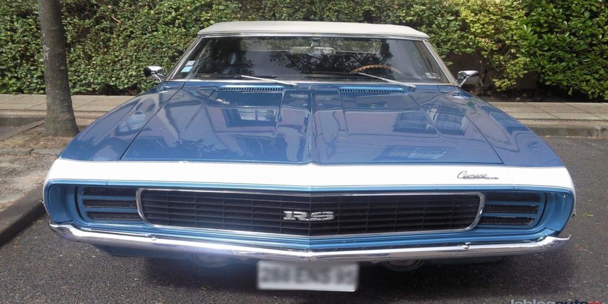 C’est en me baladant dans le Val d’Oise, que je suis tombé sur cela : une Chevrolet Camaro RS de couleur bleue à bandes blanches de première génération en version cabriolet.