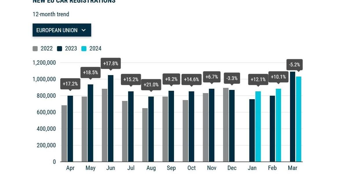 Le marché automobile de l’Union européenne a enregistré sa première baisse de l’année en mars 2024, enregistrant une baisse de 5,2 % pour atteindre 1 million d’unités.