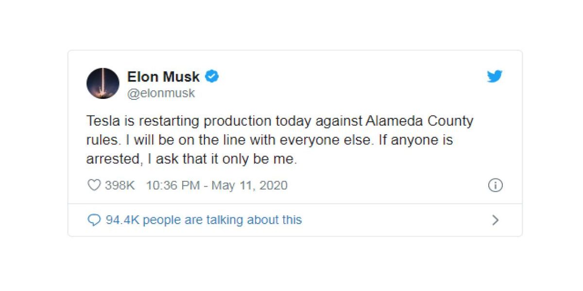 Tesla semble défier l’ordre émanant de lmenacé la Californie de déplacer ses activités à terme si Tesla n’obtenait pas l’autorisation de reprendre.