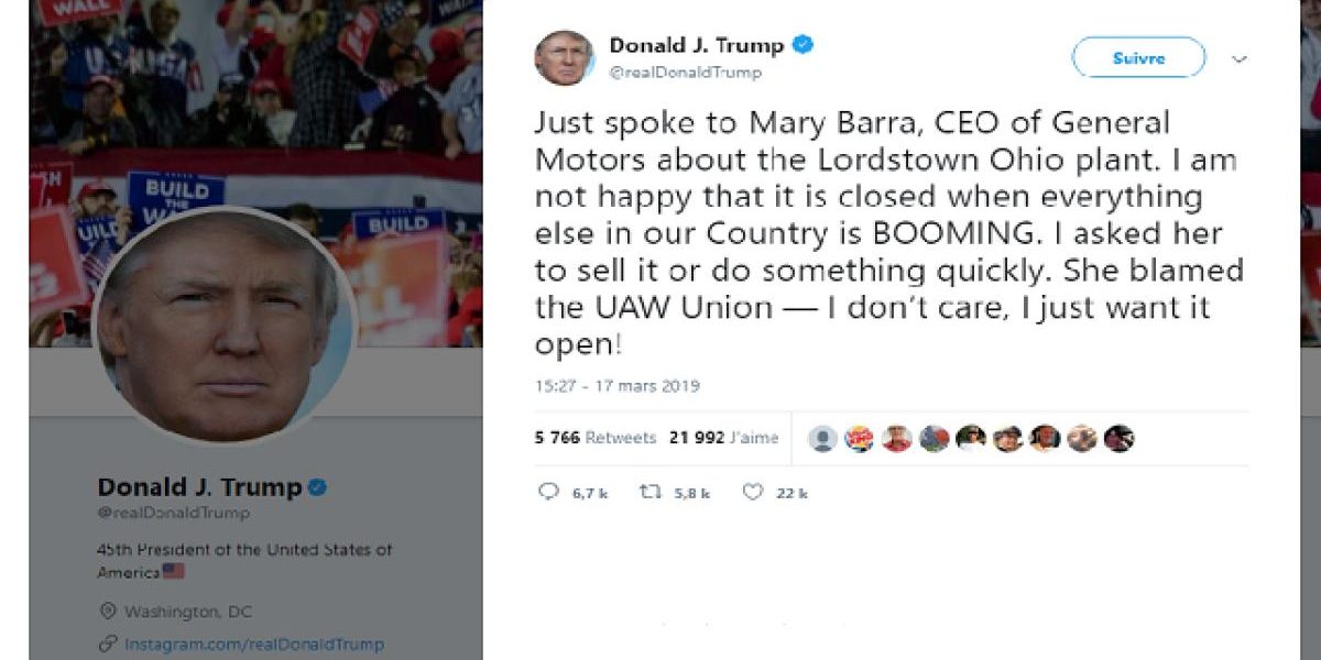 General Motors dans le collimateur de Donald Trump. Le Président américain a émis un tweet virulent dimanche à l’encontre du constructeur, visant également un responsable syndical d’une usine d’assemblage de GM dans l’Ohio que le constructeur a mis à l’arrêt en début de mois.