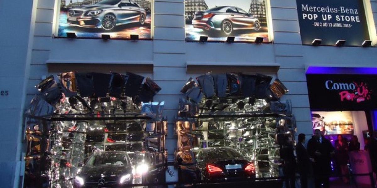 La nouvelle Mercedes CLA est une voiture de conquête. La firme à l’étoile veut s’attaquer à une clientèle plus jeune et plus urbaine. Du coup, les concessionnaires Como ont décidé d’employer un concept original: la boutique éphémère. Du 2 au 13 avril, le « pop up store » est présent près de l’Opéra, à Paris. Le clou du spectacle est la « pop up night », le 12.Visiblement, les maitres-mots de la décoration sont « arty » et « glamour ». Cela commence dés la devanture, avec ces CLA cernées de miroirs, pour mieux scintiller.