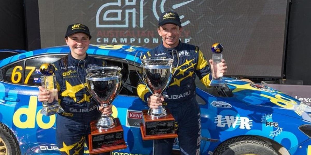 Comme on est en Austalie, les rôles sont inversés. C’est donc bien une femme, à gauche, qui soulève la coupe de champion d’Australie de rallye. Molly Taylor, avec un « M », comme une certaine Michèle…