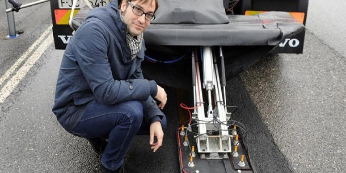 Aujourd’hui, on sait faire Volvo Trucks s’interroge sur la question et ils reconnaissent qu’ils en sont au tout début des recherches.Le souci majeur, c’est que les poids-lourd effectuent de très longues distances chaque jour. En 2012, le constructeur a bâti un circuit d’essai à Hällered, près de son fief de Göteborg. La piste mesure 400m de long. Le revêtement est recouvert de deux bandes de cuivre (signées Alstom), tel un Scalextric géant. L’un des rails correspond au positif et l’autre, au négatif. Le rail positif ne transmet du courant (du 750V) qu’au contact d’un boitier spécifique, sur un segment précis et si le véhicule roule à plus de 60km/h (donc pas de risque de coup de jus en marchant dessus.)