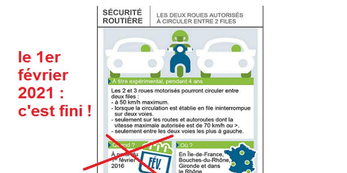 La circulation des deux-roues motorisés entre deux files de voitures, qui était expérimentée depuis 2016 dans 11 départements dont l’Ile-de-France, sera interdite à partir du 1er février, a annoncé mercredi la délégation à la Sécurité routière.