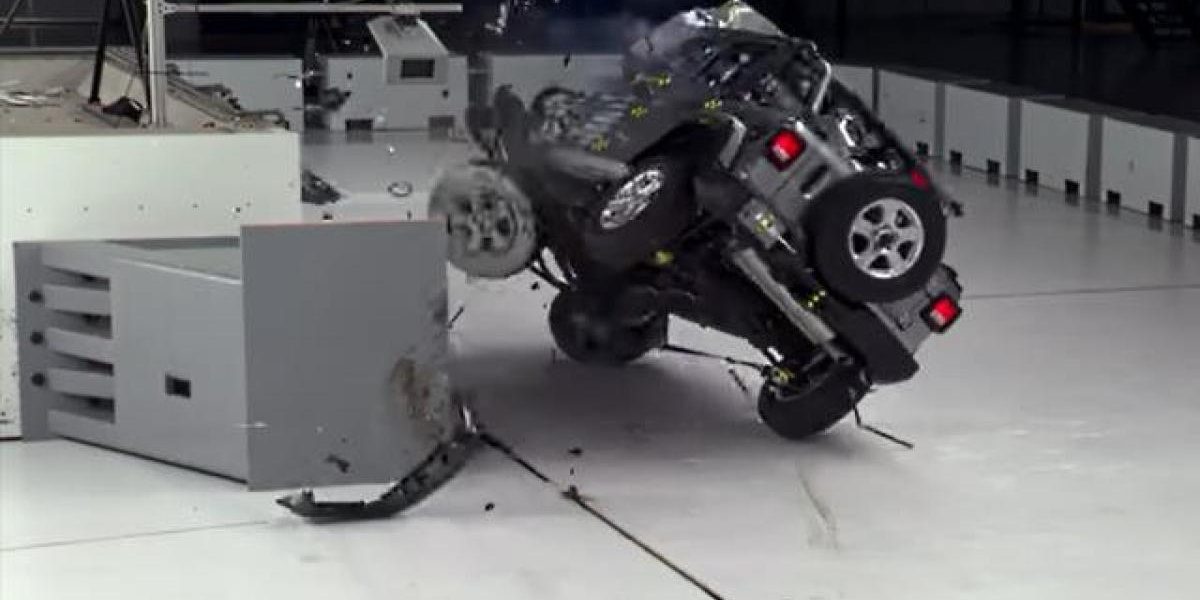 Dans la famille des organismes qui effectuent des crash-tests, l’IIHS est sans doute l’un des plus stricts. Le Jeep Wrangler se couche sur le côté lors du test dit « small overlap ».