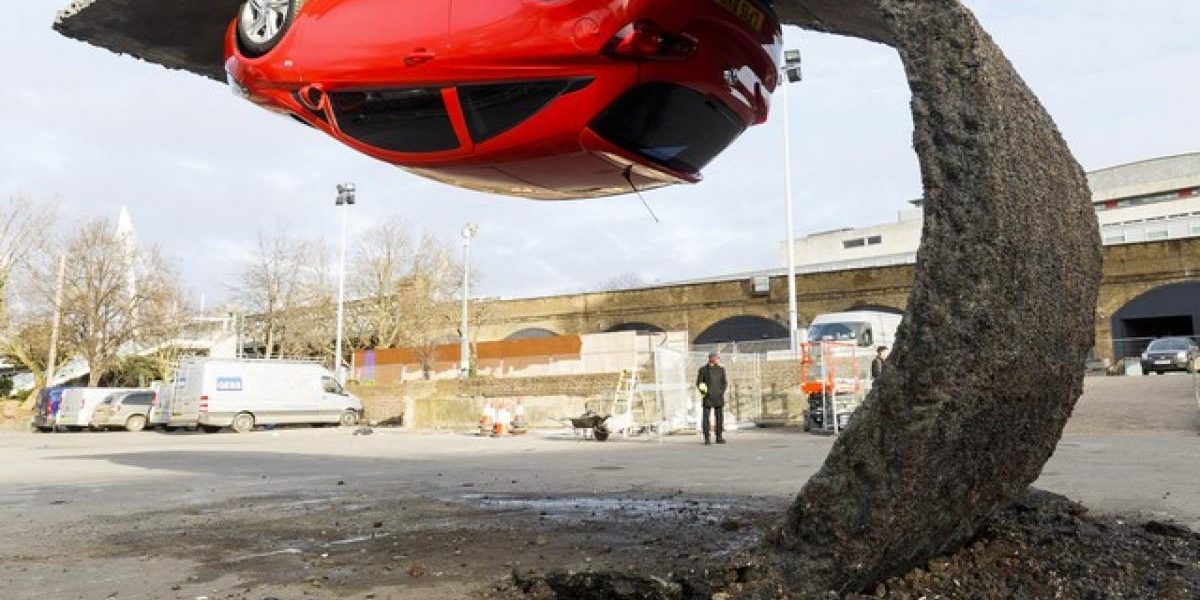 Alex Chinneck est un farceur. Il aime jouer avec les façades d’immeubles. Les renverser (avec la porte d’entrée au sommet), donner l’impression qu’elles fondent et qu’elles ont glissé. Cette fois, il s’est attaqué à une place de parking (avec une Corsa dessus), comme si un géant venait de la retourner.