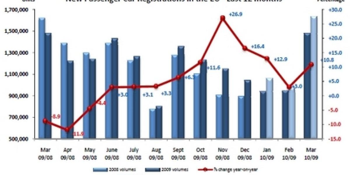 Si le marché allemand a continué de reculer les autres marchés européens d’importance permettent sur un plan global d’enregistrer une hausse de 10,8 % en mars (1 637 478 unités). Parmi ces marchés majeurs et en forte progression, on peut tout d’abord penser au marché anglais (conséquence logique d’une immatriculation en rafale avec la fin de la prime à la casse) mais aussi au marché espagnol (là encore alors que le plan de prime à la casse arrive à échéance avec 175 000 unités en ayant bénéficié sur les 200 000 du programme) et des marchés français et italien. Voici les chiffres phares pour mars mais aussi sur le cumul des trois premiers mois de l’année.
