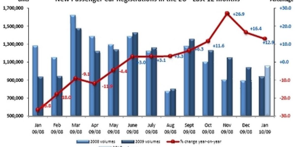 Selon les chiffres officiels fournis par l’Association des constructeurs européens d’automobiles (ACEA), le marché européen a bouclé le mois de janvier dernier en progression de 12,9 % à 1 058 686 unités. Cette hausse est à tempérer cependant. En période pré-crise du secteur automobile (ou pré-crise profonde tout court), le recul atteint 17,3 % par rapport au mois de janvier 2008.