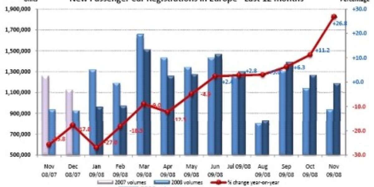 Le marché européen poursuit sa progression enregistrant en novembre dernier une hausse de 26,6 %. Celle-ci fait suite aux progressions acquises en octobre et septembre à hauteur respective ACEA) les immatriculations ont donc grimpé de 26,6 % à 1 182 082 unités. Une hausse à relativiser toutefois avec le mois de novembre 2008 marqué par un repli de 25,8 % et un jour ouvré supplémentaire.