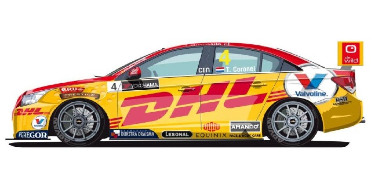 L’an dernier, la voiture de Tom Coronel était principalement bleue avec comme sponsor titre la marque de vêtements McGregor. Cette année le groupe néerlandais échange sa place avec la société de transport et logistique DHL et forcément la voiture vire au jaune et rouge.