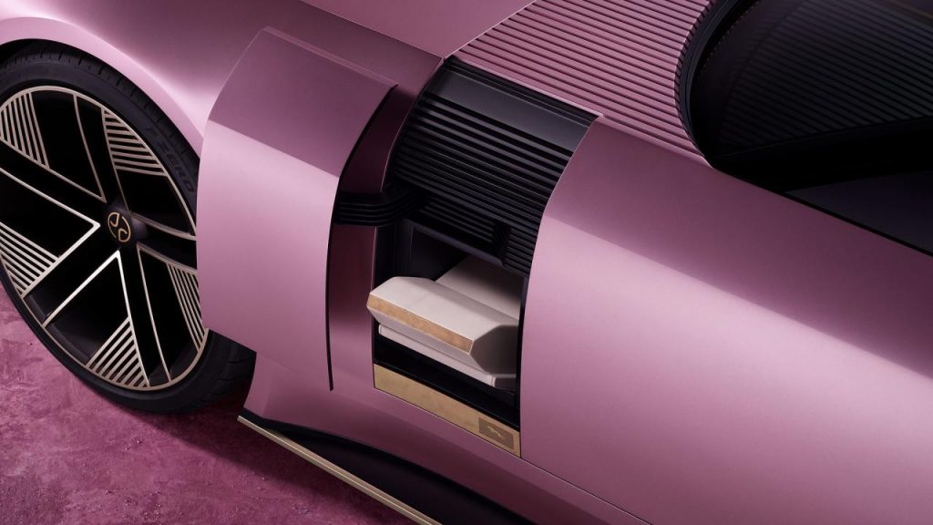Pour le reste, le concept est étrange, des ailes très marquées, très élargies, mais une grille à l’avant et à l’arrière, comme un réfrigérateur ou un climatiseur. L’arrière est composé d’une grille et de deux traits lumineux, en haut et en bas. Pas à droite et à gauche comme on en a l’habitude. L’avant est aussi simple avec la fausse grille et deux traits pour les feux. L’avant et l’arrière se répondent symétriquement.