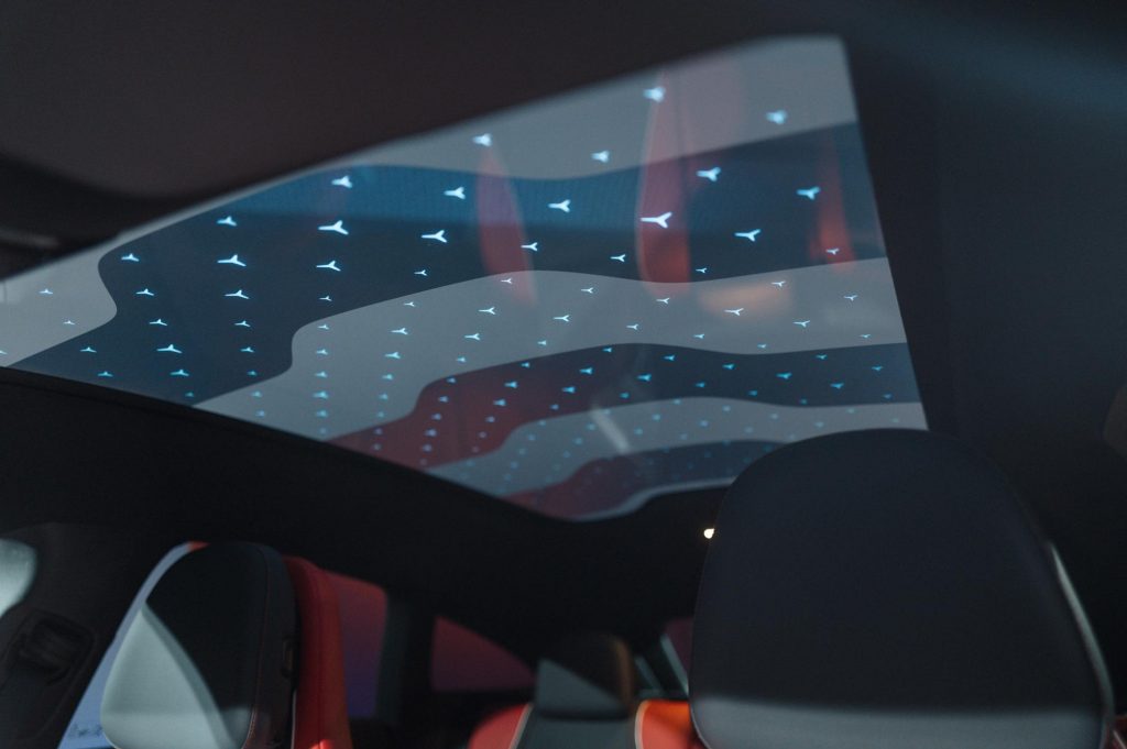 A l’intérieur, le toit panoramique, d’un seul tenant, s’étend du pare-brise à l’arrière et est complété par un becquet partiellement peint, donnant l’illusion que le toit en verre se prolonge dans la lunette arrière. Il est fabriqué en verre feuilleté isolant thermique, avec un revêtement infrarouge réfléchissant et à faible émissivité (LowE), qui réduit la chaleur en été et les pertes thermiques en hiver. Une fonction optionnelle permet de modifier la transparence du toit en 10 à 20 millisecondes. Il peut ainsi devenir opaque pour plus de confidentialité et une meilleure protection contre l’éblouissement.