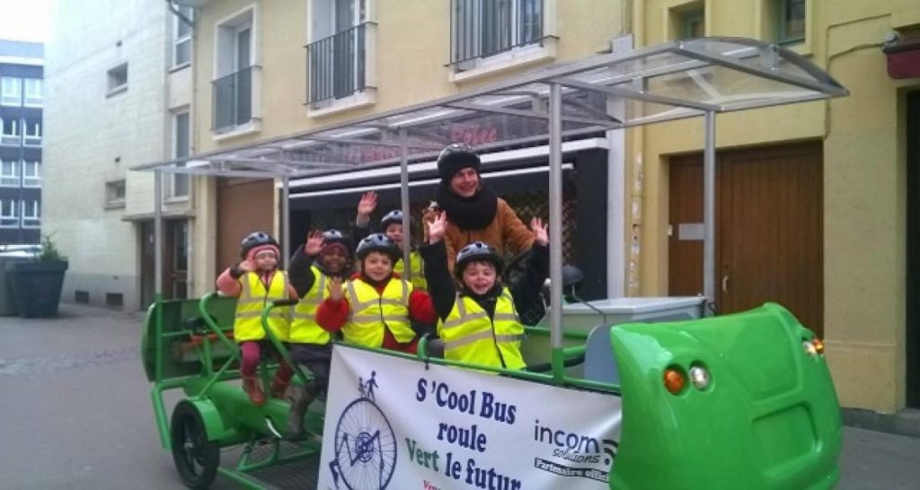 Depuis le 3 janvier 2017, les élèves de l’école primaire Anatole France utilisent ce bus. Les bouts de chou sont équipés de casques et de gilets rétro-réfléchissants. Protégés par des filets et éventuellement pas un toit amovible pour les intempéries, ils pédalent pour aller à l’école, et en revenir. Et visiblement, sans rechigner.