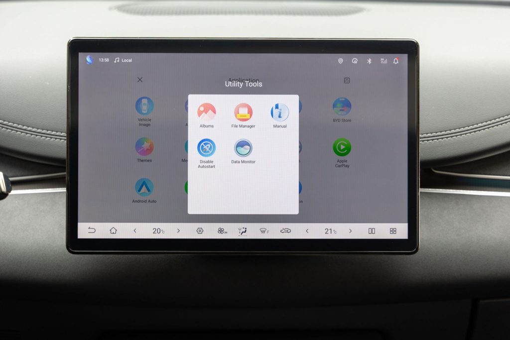 À l’intérieur, BYD, là aussi, comme d’ailleurs beaucoup de marques chinoises, apprend encore plus vite. La sobriété a semble-t-il guidé les auteurs du dessin de la planche de bord, puisque tout semble s’articuler autour du très grand écran de 15,6’’. On regrette d’ailleurs que ce dernier ne pivote pas, comme dans d’autres BYD. L’instrumentation derrière le volant se contente d’une dalle plus petite, qui rassemble toutes les informations essentielles liées à la conduite. Honnêtement, surtout au regard du prix, on le verra, la finition et les assemblages apparaissent vraiment très corrects.