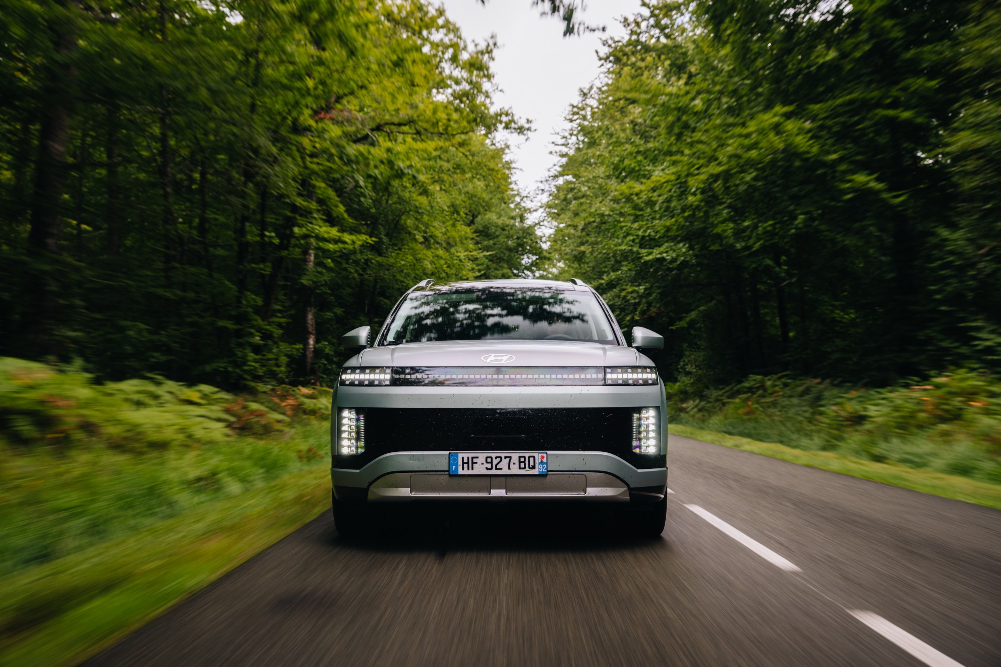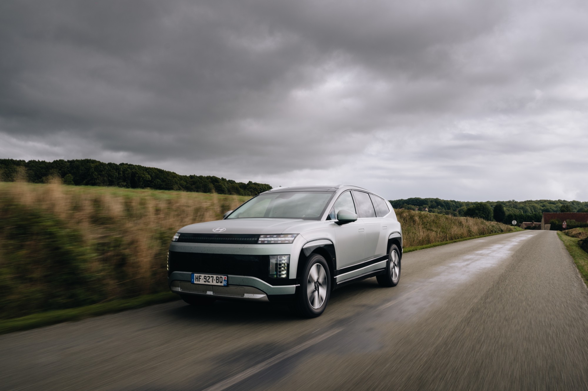 Ses 307 chevaux et, surtout, son couple maxi camionesque de 605 Nm suffisent très largement pour déplacer ce Ioniq 9 (2 582 kg). Il décolle quand on le sollicite, à l’image de son 0 à 100 km/h abattu en 6,7 s. Ses relances sont tout aussi énergiques, bien entendu, mais pas forcément nécessaires ailleurs que sur l’autoroute. Car, une fois que l’on quitte les grands axes où le Ioniq 9 se sent particulièrement à l’aise, on subit alors ses grandes cotes et son poids sur le réseau secondaire. Il faut simplement accepter l’idée de ne pas conduire une voiture hyper dynamique, malgré sa puissance confortable.