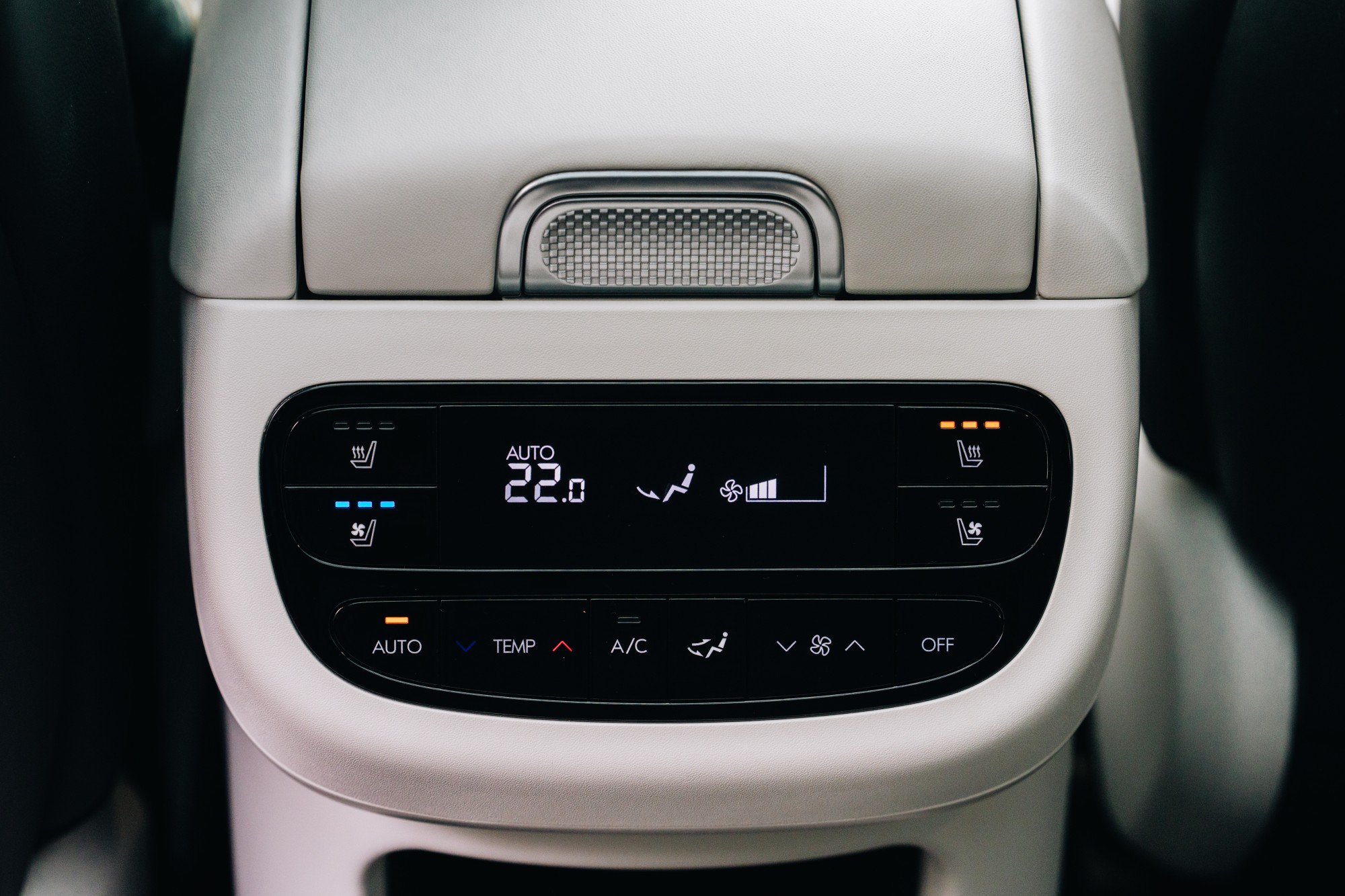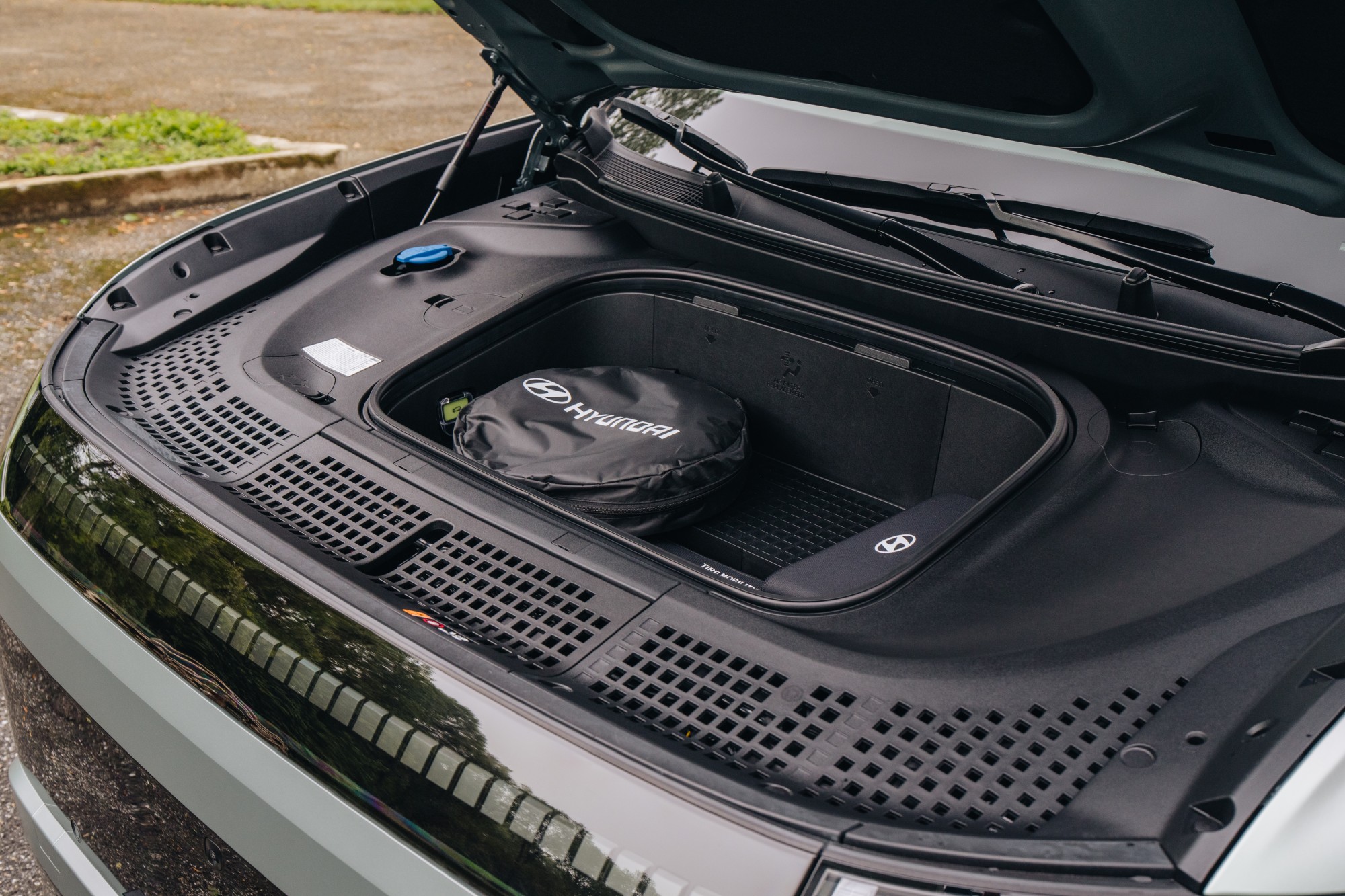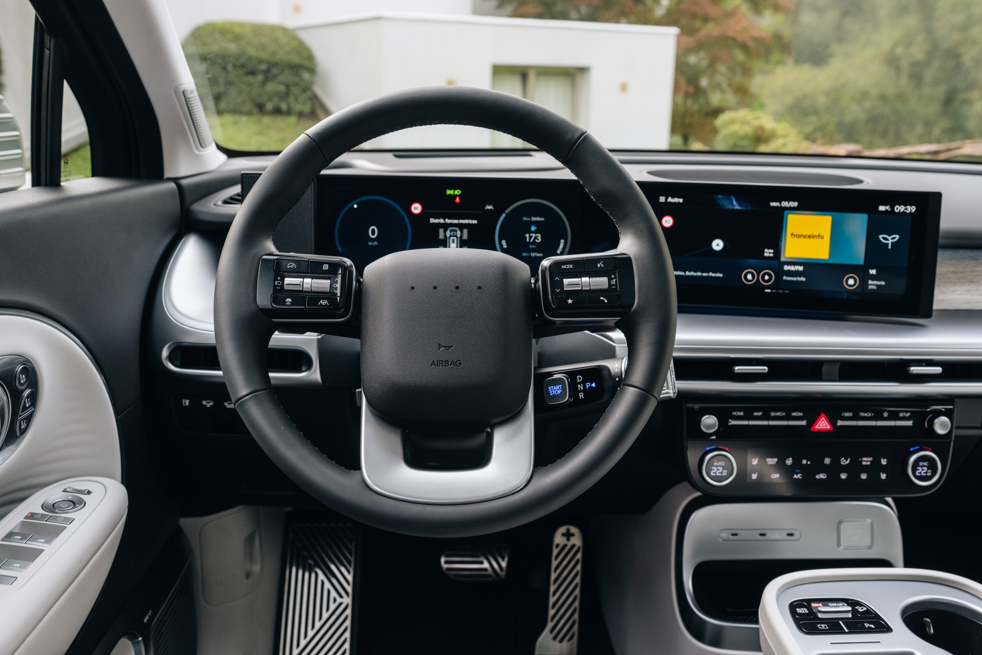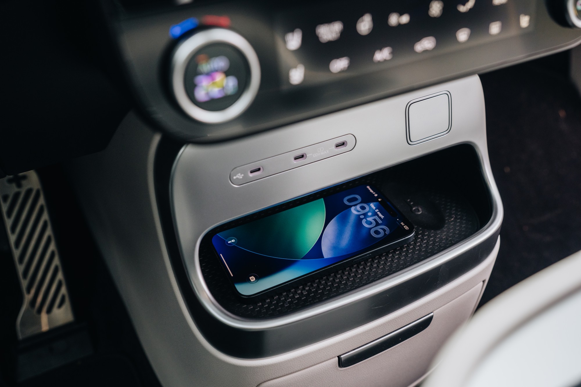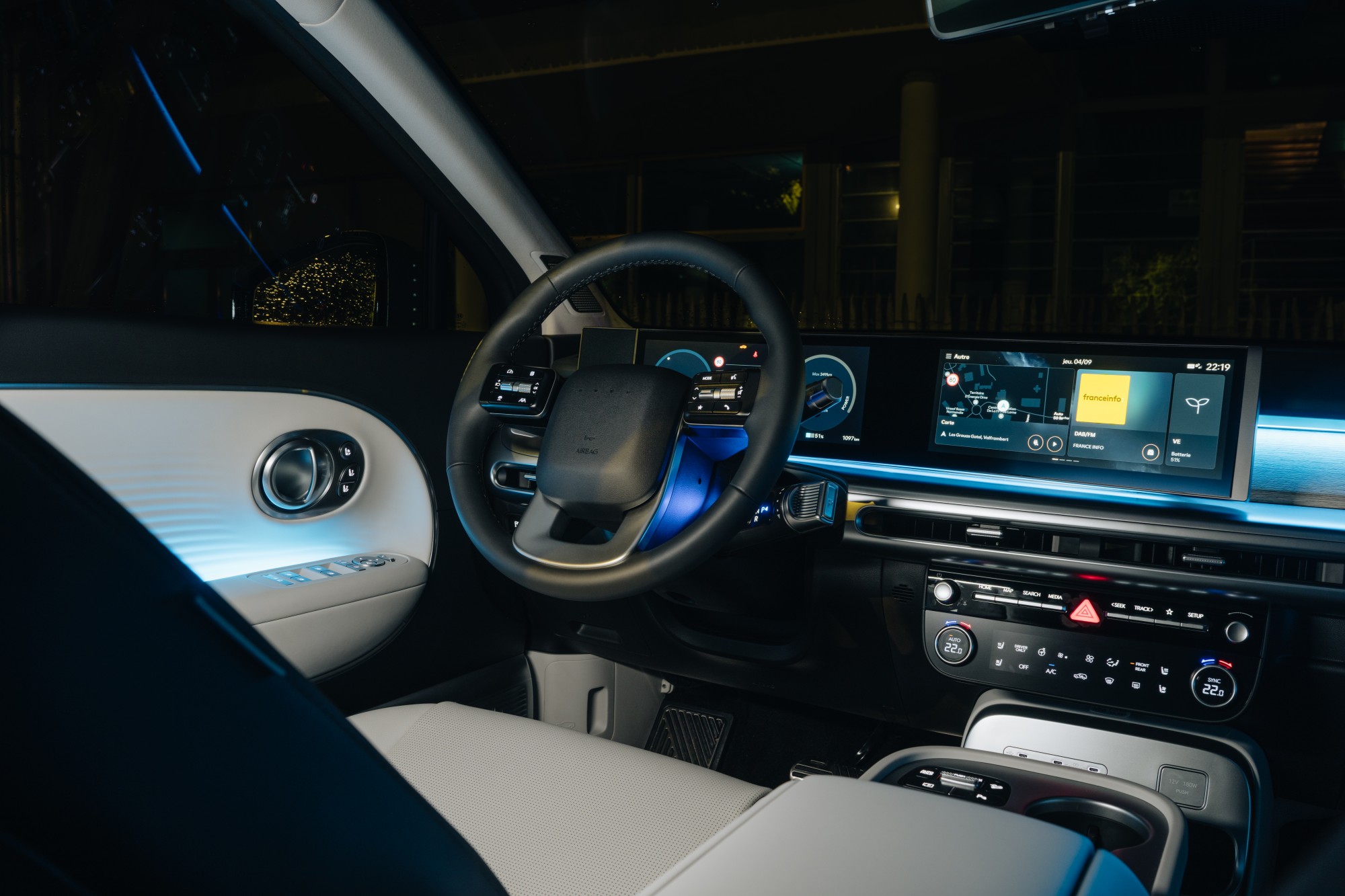 L’atmosphère, volontairement hyper futuriste, ne cherche pas à trop en faire pour autant. La lecture des instruments et la position des différents boutons rendent l’adaptation aisée, même quand on ne connaît pas l’univers Hyundai. Il reste beaucoup de commandes physiques, et les écrans ne sont pas exagérément grands. On aurait aimé une touche premium un peu mieux marquée. Son côté asiatique se ressent aussi dans les équipements, dont un compartiment désinfectant par UV-C pour téléphone ou n’importe quel objet de petites dimensions. On peut même recharger avec une puissance de 100 W un appareil électronique avec un câble adapté.