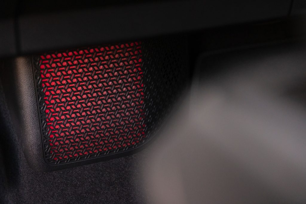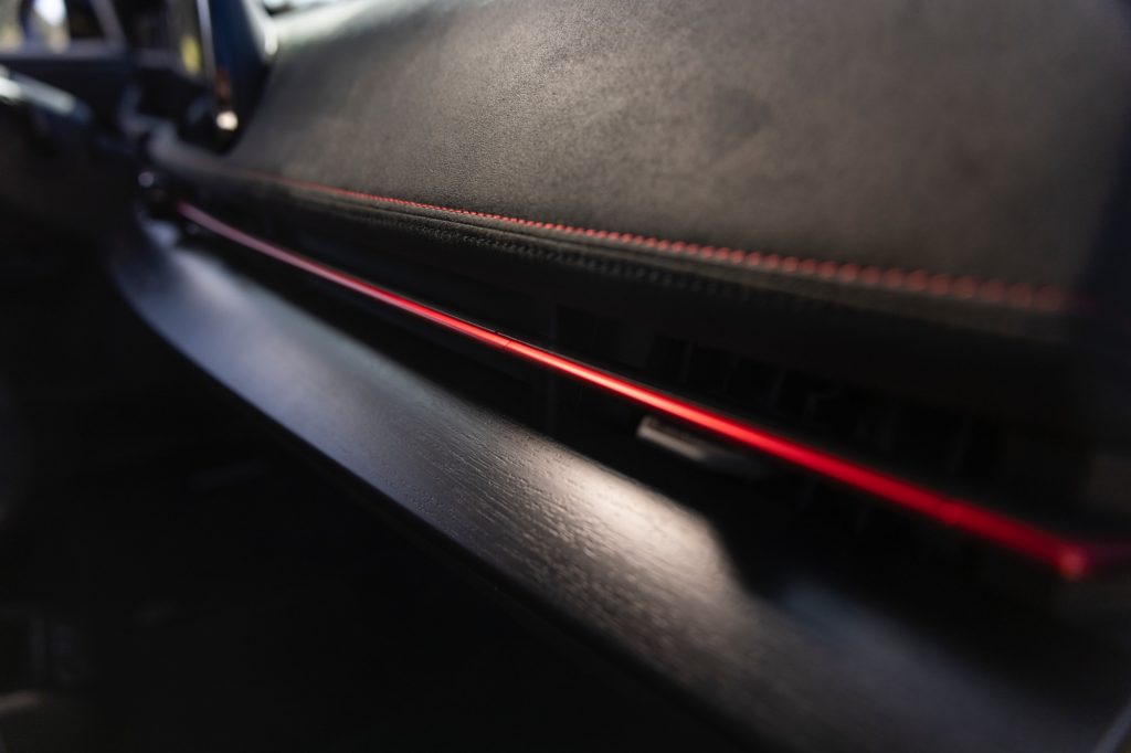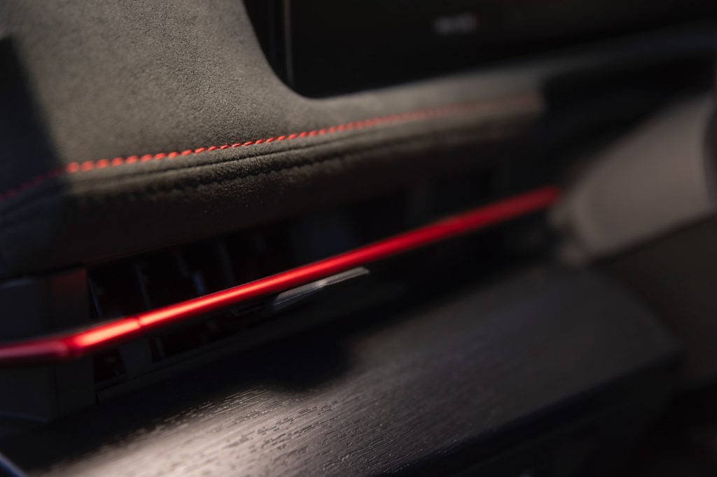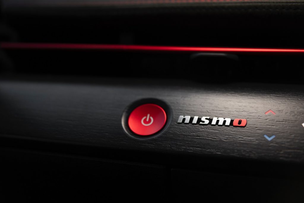 À bord, le traitement Nismo est tout aussi affirmé. L’éclairage d’ambiance rouge enveloppe l’habitacle d’une atmosphère un peu plus motorsport, tandis que les surpiqûres rouges ornent le volant et son anneau central rappelle subtilement l’univers du sport automobile. Le bouton de démarrage anodisé rouge vient parfaire la touche Nismo de cet intérieur.