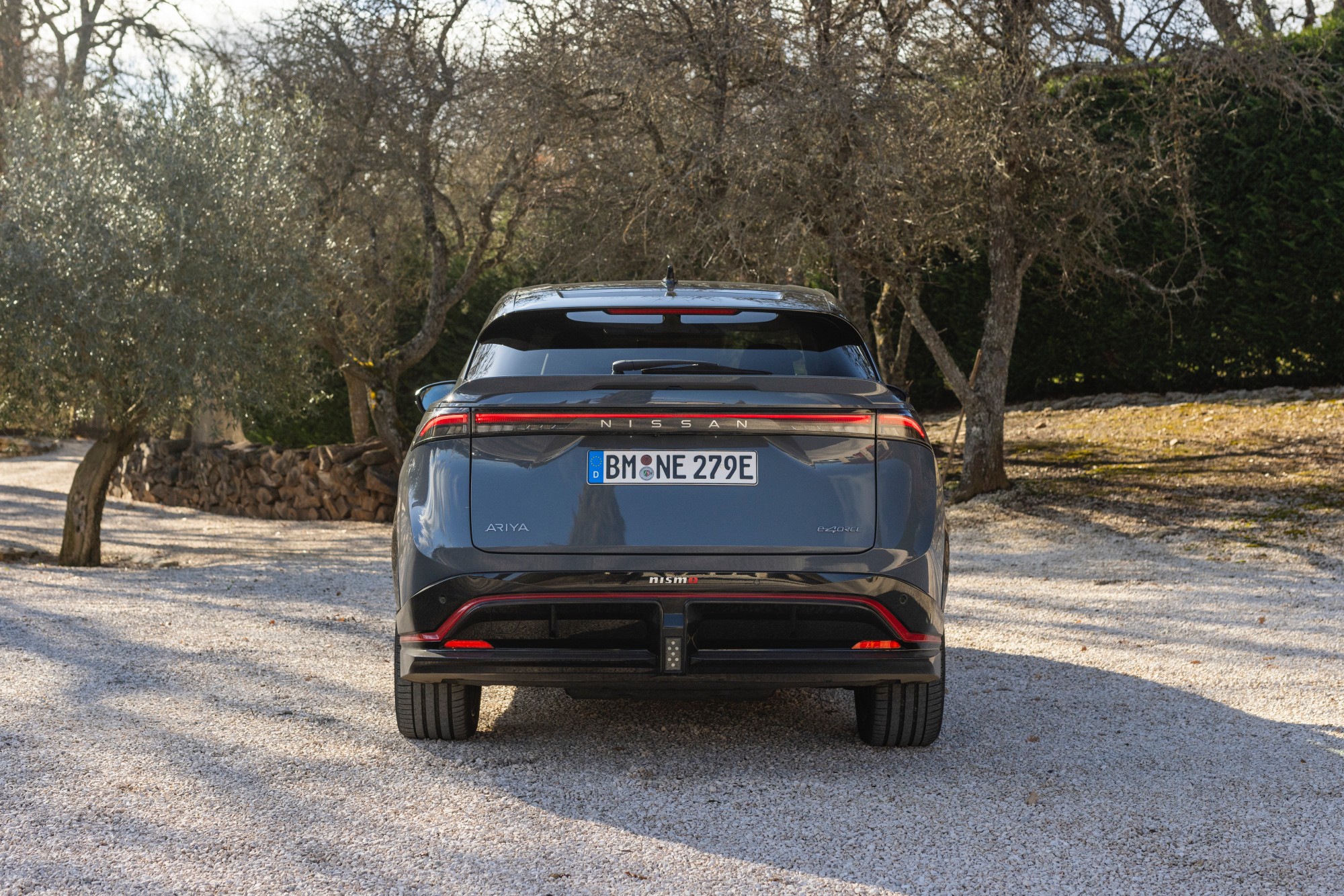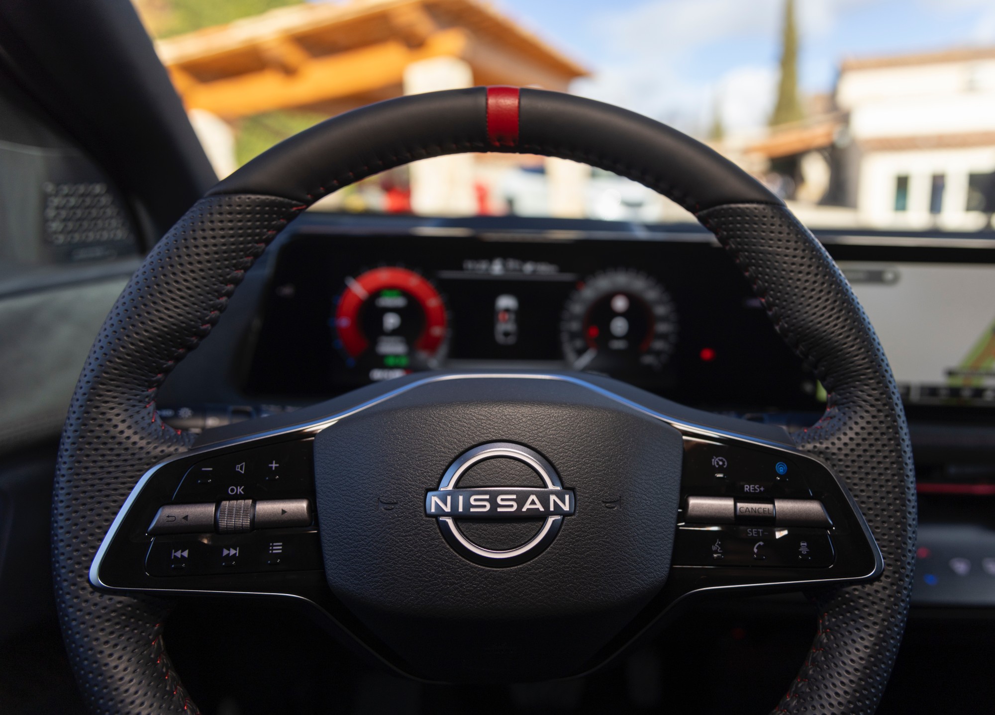 Autre détail marquant : les jantes Enkei de 20 pouces, développées spécialement pour Nismo, chaussées de pneus Michelin Sport EV (pas spécifiques). Ils prennent sans doute à eux seuls une grosse part de responsabilité dans le comportement routier optimisé. Enfin, le bouclier arrière arbore un feu antibrouillard inspiré de la Formula E, un clin d’œil au département compétition de la marque.