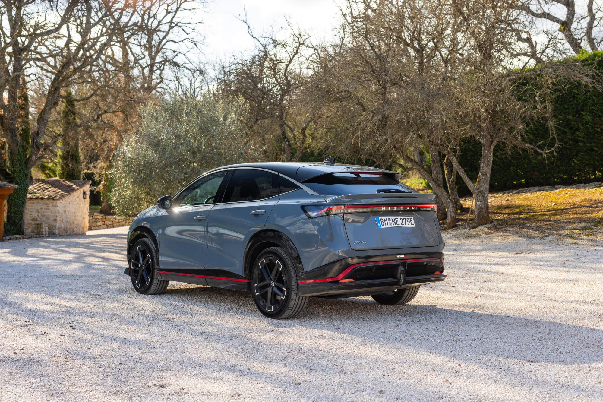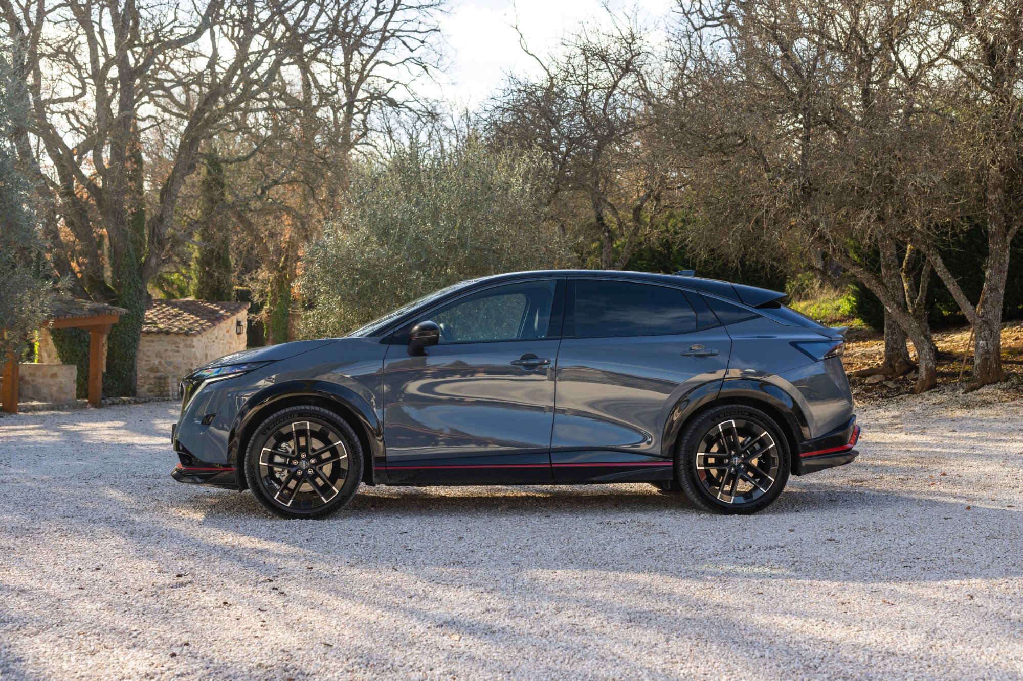 Dès le premier regard, l’Ariya Nismo impose son caractère. Disons le tout de suite, on est plus proches de Nismo version Juke RS dans l’esprit, que de la GT-R, vous l’avez déjà compris. Les boucliers spécifiques, sculptés pour améliorer l’appui, s’habillent d’un liseré rouge signature. Le becquet arrière et le fond plat avec double diffuseur optimisent le flux d’air, réduisant le coefficient de portance de 40 %.