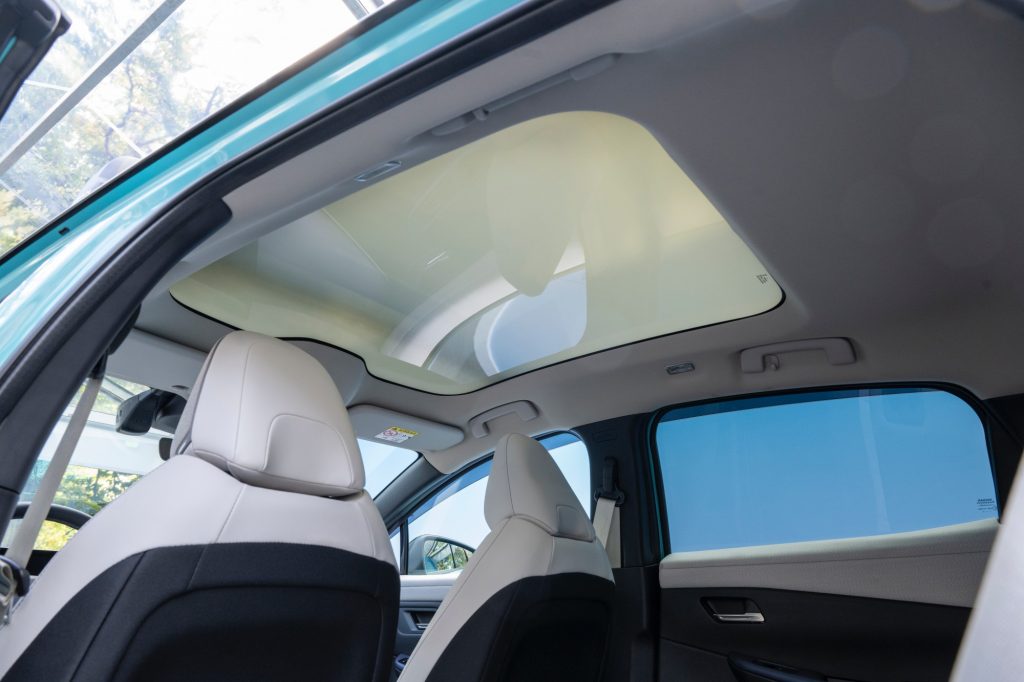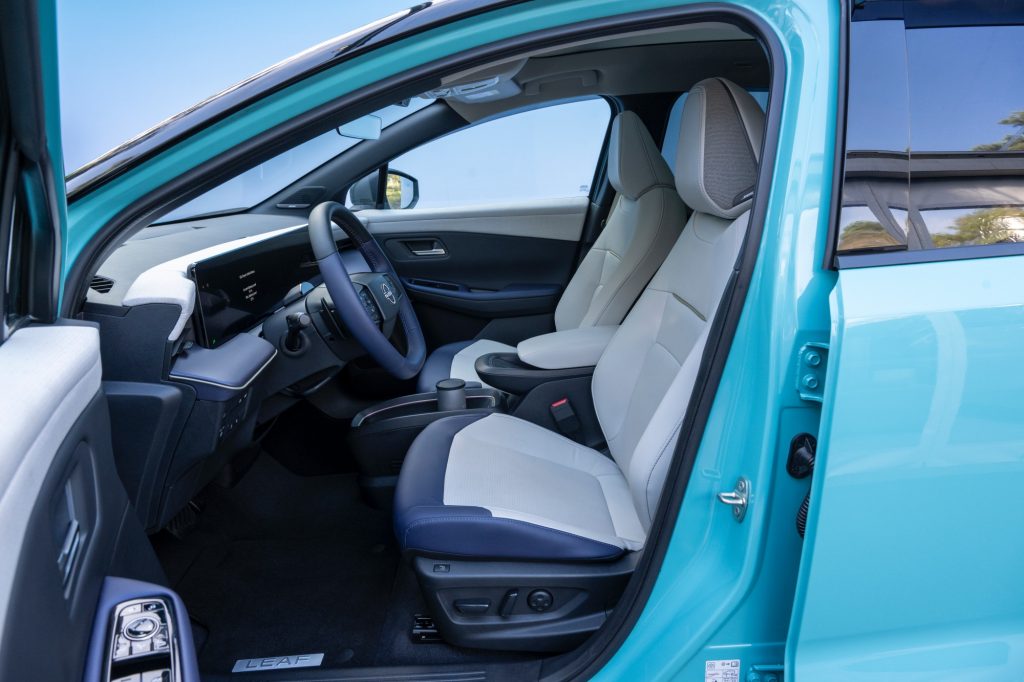 À l’intérieur, l’ambiance marie technologie et luminosité. Le toit panoramique à opacification variable diffuse une belle clarté dans l’habitacle, tout en filtrant la chaleur quand il le faut, grâce à son verre athermique. L’espace reste correct pour quatre occupants, un peu plus compté pour cinq, comme très souvent dans la catégorie. La finition fait un énorme bond en avant par rapport à la précédente LEAF.